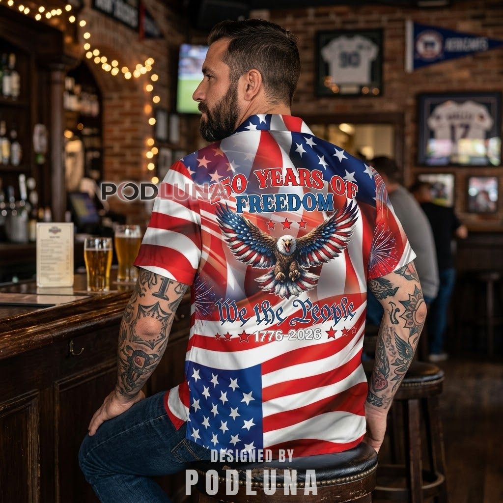 This is the USA anniversary tropical shirt you wear when you want the design to do the talking before you say a single word. The photorealistic rendering of each landmark gives it a depth that flat graphics simply cannot replicate, and the fireworks exploding behind the Capitol dome create a sense of occasion that makes the shirt feel like it was made for exactly this moment in American history. Podluna built this one for the person who appreciates the full weight of what 250 years actually represents.