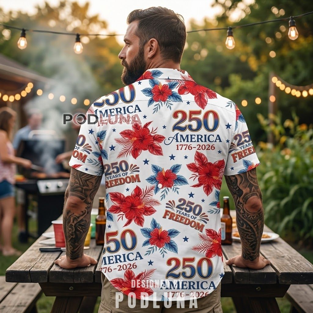 The pairing of hibiscus florals with commemorative typography is the design’s defining move — it takes what could have been a straightforward patriotic print and gives it the ease and personality of a summer shirt you’d actually reach for beyond the holiday. The red blooms carry the patriotic palette naturally without leaning on flags or eagles, letting the “250 Years of Freedom” text do the commemorative heavy lifting while the florals keep the energy light and warm. The botanical leaf motifs in navy add depth to the overall print without darkening the base. Podluna designed this for the anniversary celebrant who wants the milestone acknowledged without the shirt feeling ceremonial — festive enough for the occasion, relaxed enough for the entire season.