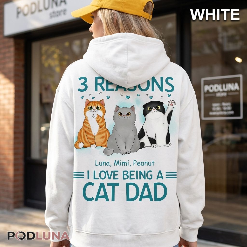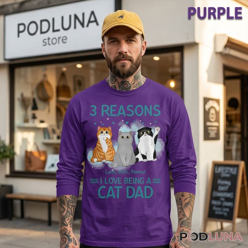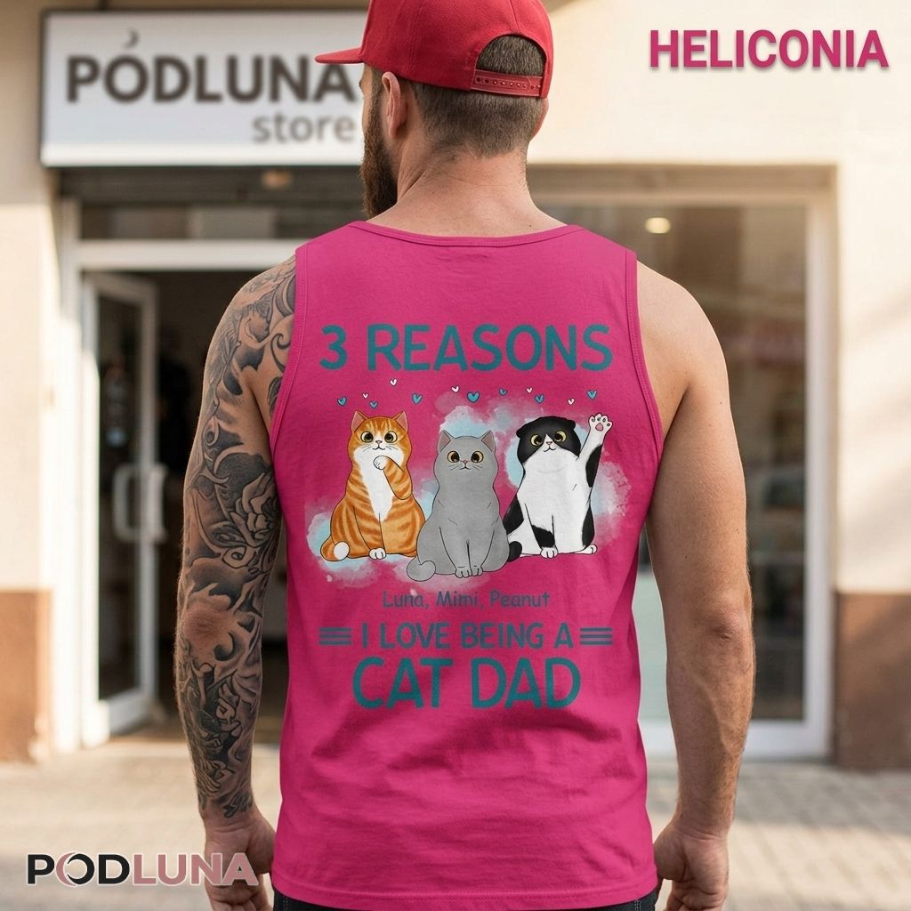 A personalized cat dad shirt putting his three most important reasons front and center in the most charming way possible. The design features three distinct cat illustrations side by side — an orange tabby, a grey cat, and a tuxedo cat waving a paw — each with their own personality on full display, set against a soft watercolor cloud backdrop with small heart accents floating above. “3 REASONS” leads boldly at the top, the cats’ personalized names appear beneath each one, and “I LOVE BEING A CAT DAD” closes the design with dash accents on each side — simple, warm, and impossible not to smile at.