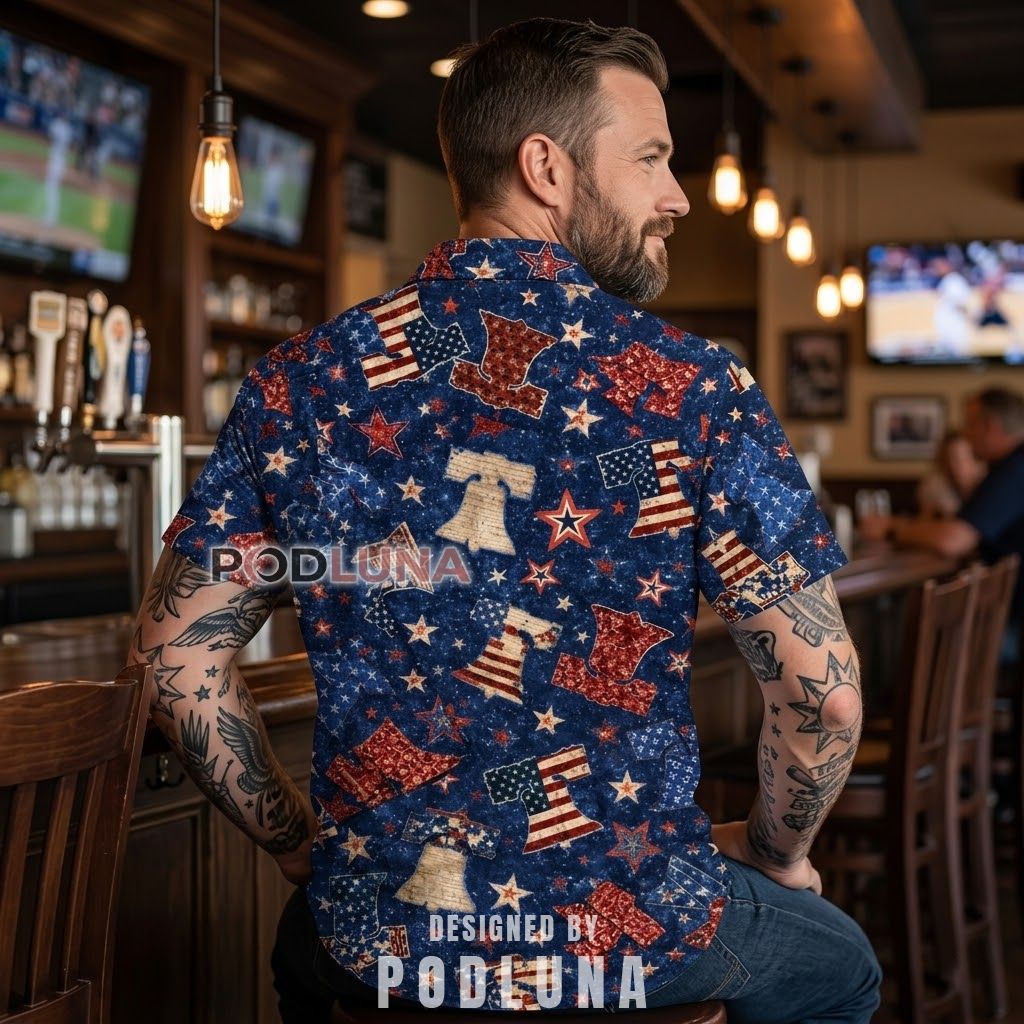 There is a quiet confidence that comes with wearing American history rather than just celebrating it, and the 4th of July Liberty Bell Aloha Shirt channels exactly that. Vintage-textured Liberty Bells, weathered American flags, bold stars, and distressed patriotic patch graphics scatter across a deep navy background in an all-over pattern that feels like a worn-in piece of Americana rather than a seasonal novelty.