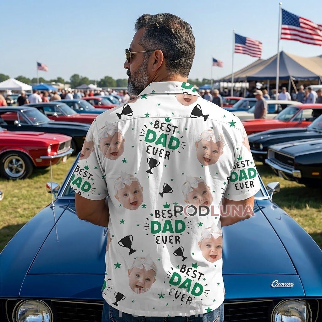 This custom photo best dad ever trophy Hawaiian shirt prints a real photo of his child’s face across a clean white all-over surface alongside bold green and black “Best Dad Ever” lettering, black trophy silhouettes, green star accents, and crown details that scatter through the full repeat in a design that turns a straightforward title into a full award ceremony printed across every button. The bright, uncluttered palette gives this personalized best dad shirt a celebratory energy that reads instantly from across a car show lot or a backyard gathering without needing a single word of explanation.