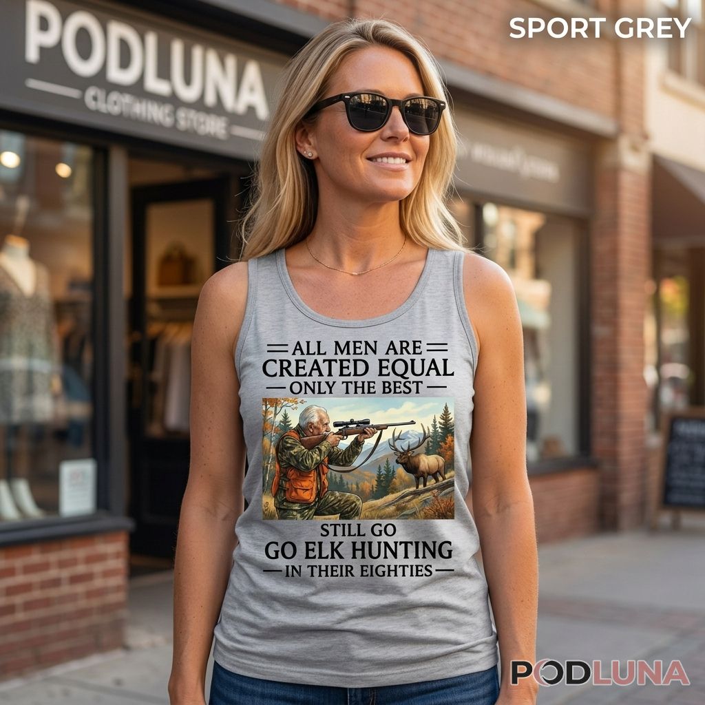 A bold declaration of hunting dedication appears on this t-shirt celebrating men who continue pursuing elk well into their eighties. The design features “ALL MEN ARE CREATED EQUAL” at the top in white uppercase letters with decorative lines on each side. Below, “ONLY THE BEST” appears in matching white capitals with lines. At the center, a detailed illustration shows an elderly hunter in camouflage jacket and orange vest, aiming a scoped rifle at a majestic bull elk standing in an autumn mountain landscape. The scene includes evergreen trees, golden fall foliage, and mountain backdrop rendered in realistic detail that captures the essence of elk hunting. Below the illustration, “STILL GO” appears in white text, followed by “GO ELK HUNTING” in large bold white letters, with “IN THEIR EIGHTIES” completing the message in white capitals flanked by decorative lines. The design honors hunters whose passion for elk hunting doesn’t diminish with age, suggesting the best men are those who maintain their hunting traditions and physical capability into their later decades.