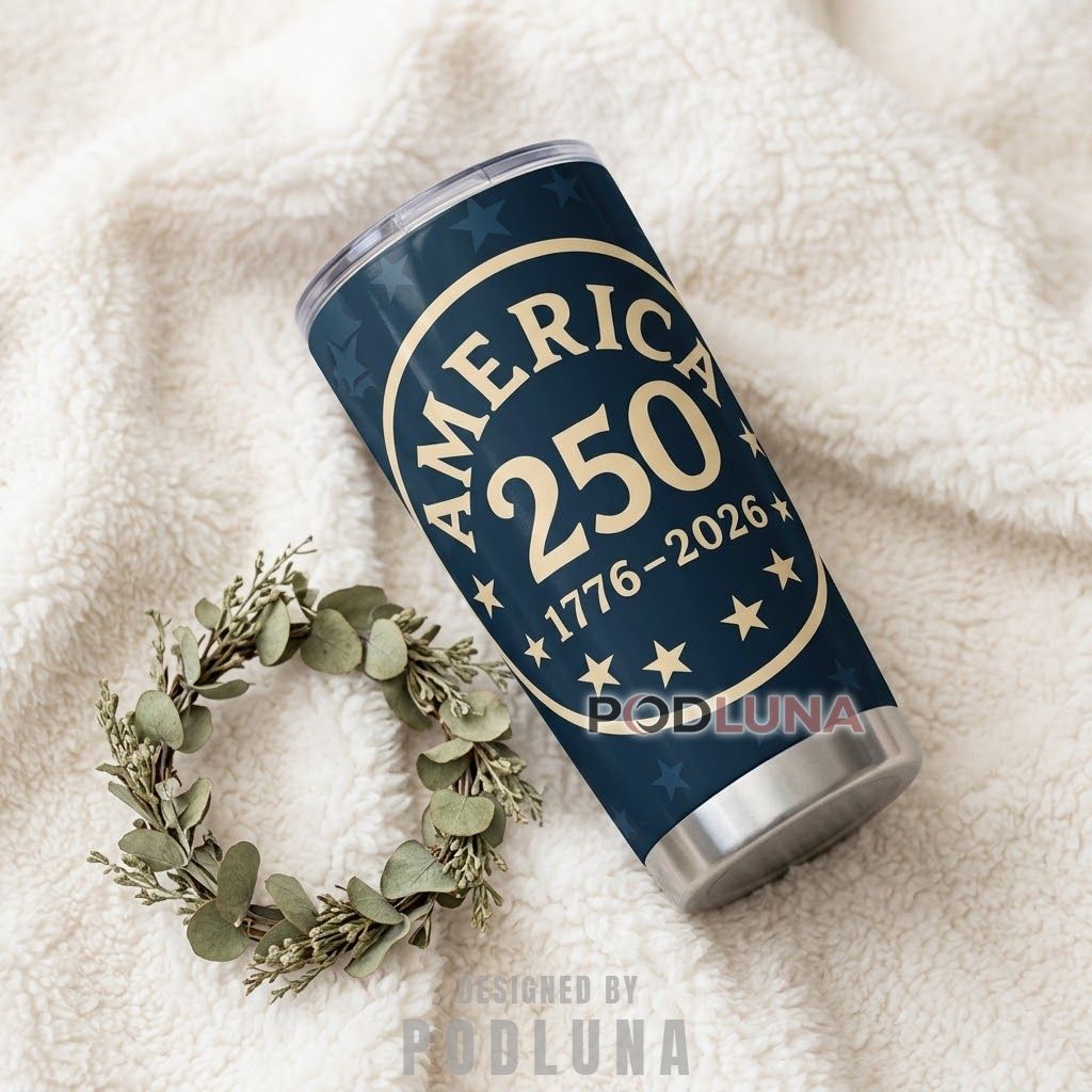 The restraint of this design is its strength. No eagles, no fireworks, no layered iconography competing for attention, just the name, the number, and the dates presented with the kind of quiet confidence that comes from not needing to oversell the occasion. “America 250” in that oval badge format has the visual authority of something issued rather than designed, and that distinction is exactly what separates this tumbler from everything louder in the category. Podluna built this vintage badge 250th anniversary tumbler for the person whose taste runs toward the enduring rather than the elaborate.