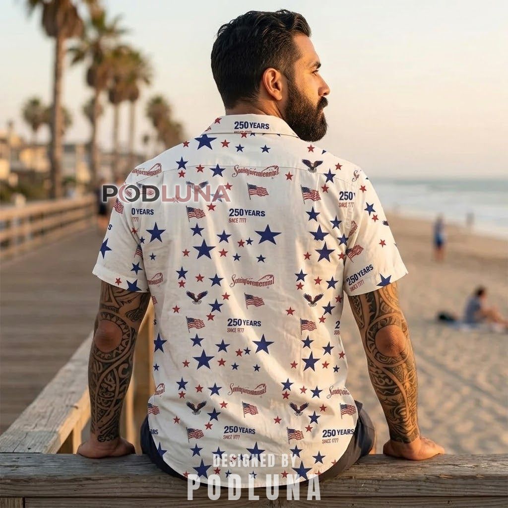 Where most patriotic shirts go bold and saturated, this America 250th Anniversary Hawaiian Shirt takes the quieter, more refined route — a warm off-white base covered in an all-over toss pattern of navy and red stars in varying sizes, miniature American flags, small bald eagle motifs, and the repeating “250 Years Since 1776” text scattered across the fabric like a vintage commemorative print. The result is a patriotic stars flag graphic shirt that reads as effortlessly cool rather than loudly festive, the kind of design that works as well at a beach boardwalk as it does at a Fourth of July gathering.