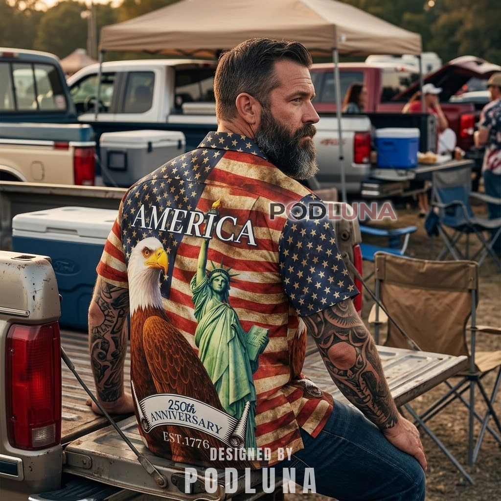 Designed to wear the milestone as loudly as it deserves, this America 250th Anniversary Hawaiian Shirt delivers a full-front commemorative composition — the word “AMERICA” arching in bold navy collegiate type across the chest, a hyper-detailed bald eagle commanding the center, the Statue of Liberty flanking both sides, fireworks exploding across a waving flag backdrop, and the “Celebrating 250 Years” banner anchoring the base. Every element of this patriotic eagle liberty graphic shirt is scaled for maximum impact, the kind of all-over print that reads as a complete artwork rather than a repeating pattern.