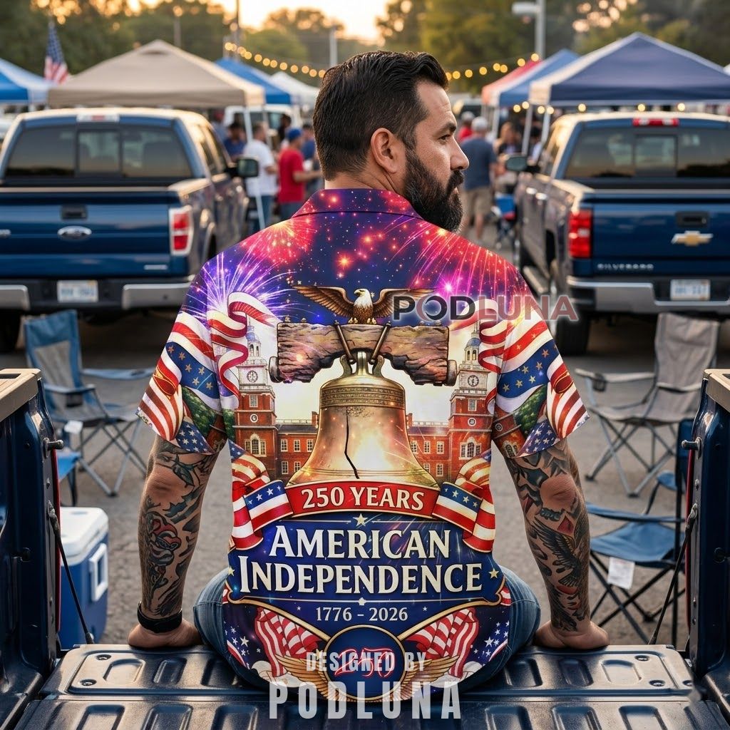 A shirt that captures the full spectacle of the milestone, this America 250th Anniversary Hawaiian Shirt wraps the entire garment in a dramatic, photorealistic composition — the Liberty Bell glowing at center with Independence Hall rising behind it, a bald eagle soaring overhead, fireworks exploding across a deep twilight sky in purple, gold, and red, waving flags sweeping the sides, and the “250 Years American 1776–2026” commemorative banner anchoring the base. This liberty bell fireworks graphic shirt treats the 250th not as a backdrop but as the entire visual event.