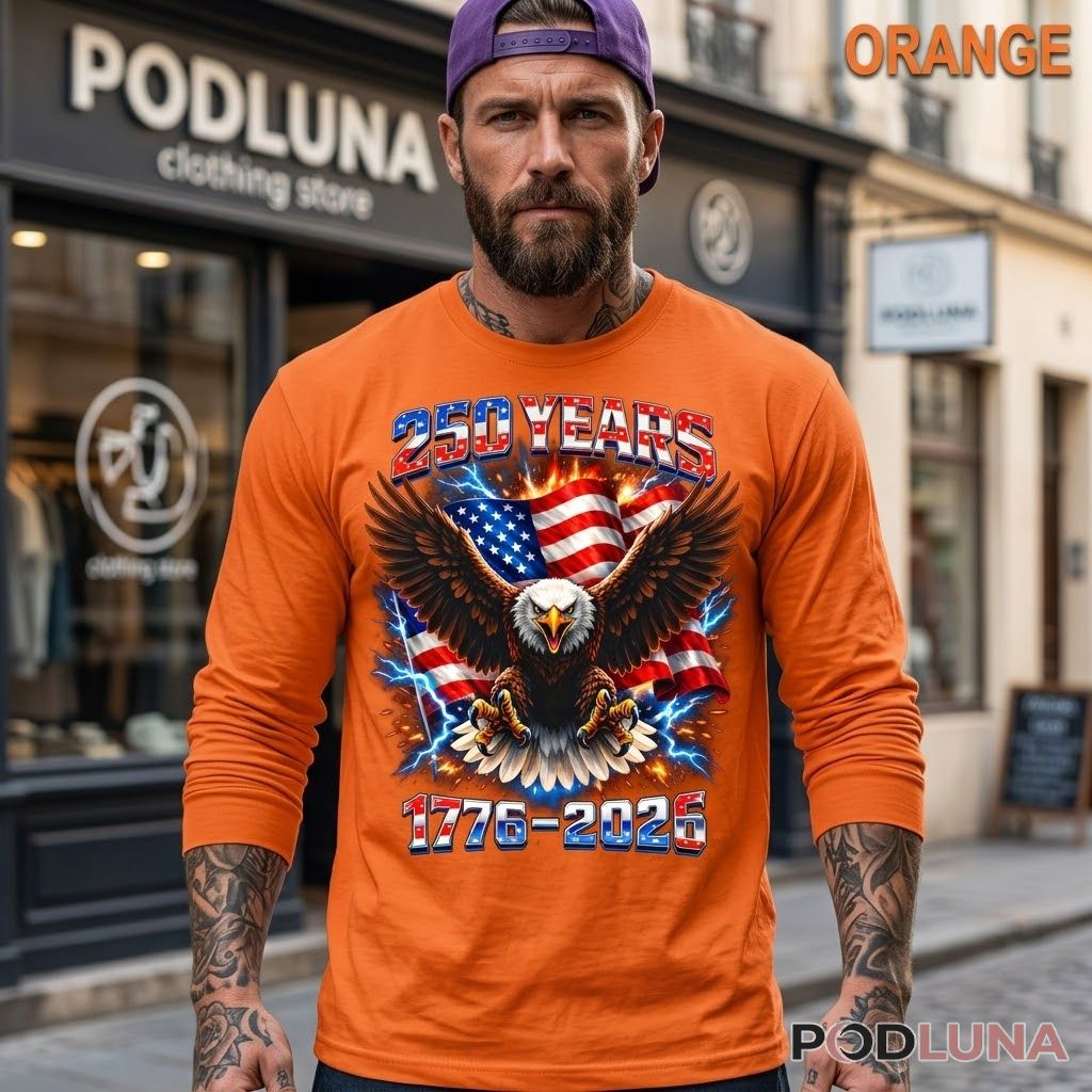 This design operates at a completely different voltage than most patriotic shirts. The eagle isn’t perched or posed, it’s arriving, talons forward, flag in grip, lightning surrounding every feather like the anniversary itself demanded a dramatic entrance. That energy is intentional. Podluna designed this America 250 anniversary shirt for the person who believes a once-in-a-lifetime milestone deserves a once-in-a-lifetime graphic to match it.