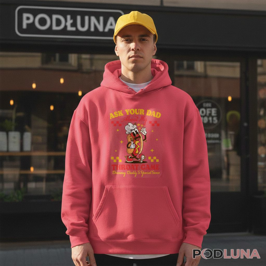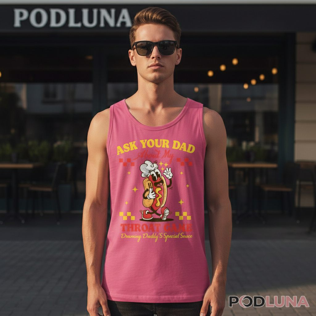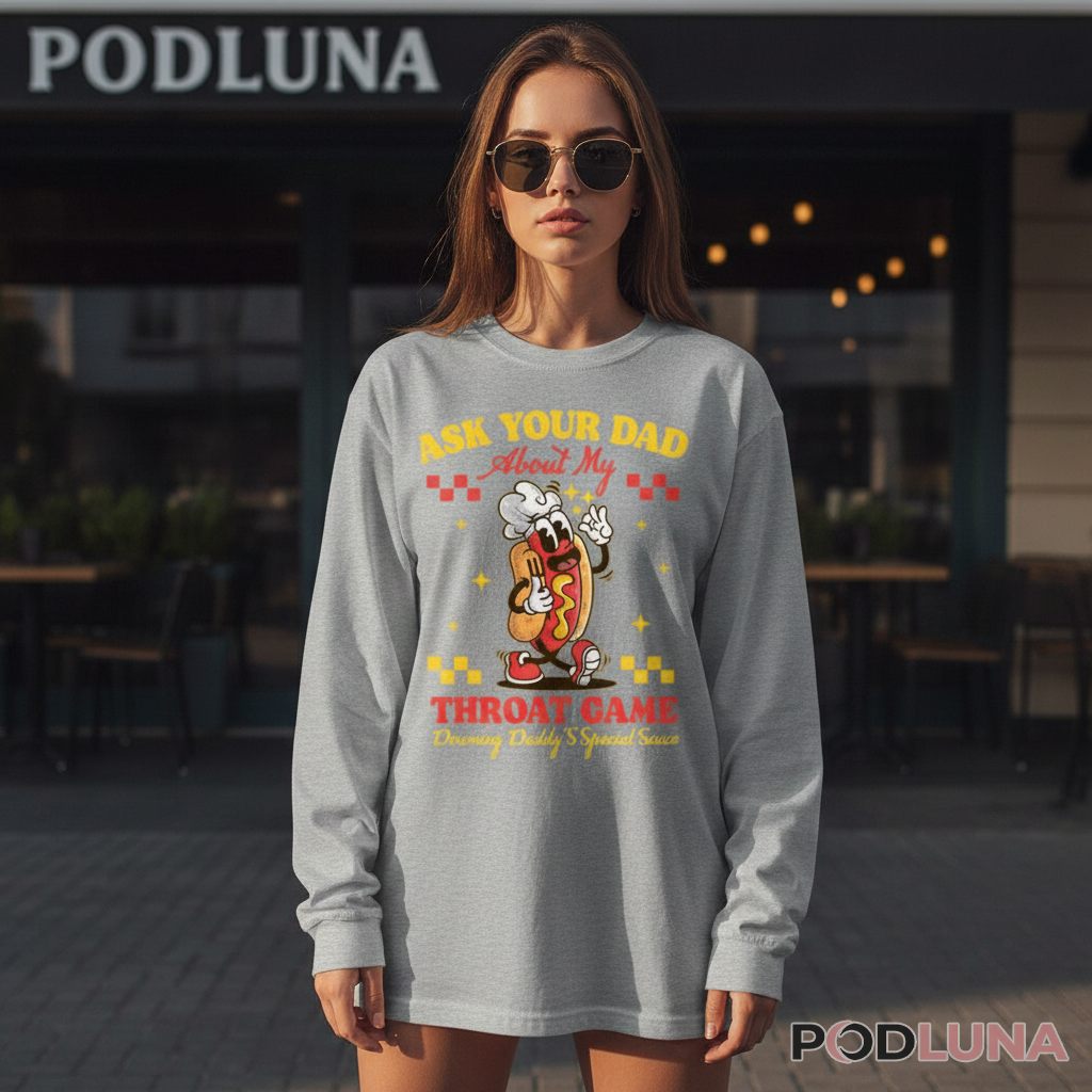 An “Ask Your Dad About My Throat Game” shirt is a design tee featuring cheeky double-meaning humor that ultimately reveals it’s about devouring hot dogs, not what the first impression suggests. This design is funny because it uses provocative wording to grab attention before the punchline clarifies it’s innocent food humor, creating a perfect conversation starter that makes people do a double-take before they laugh.
