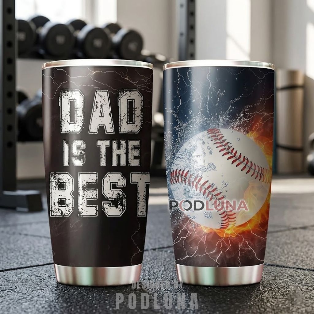 This Dad Is The Best baseball tumbler was made for the father whose love of the game is matched only by the family that shows up to every single one of his games or his kids’ games without complaint, featuring a dramatic two-sided full-wrap design with a photorealistic baseball exploding through fire and water against crackling lightning on one side, and “Dad Is The Best” in oversized distressed varsity block lettering on a dark charcoal background with lightning texture on the other, a composition that gives equal weight to the sport and the title in a way that feels earned by both. The high-voltage baseball illustration and direct declaration make this baseball dad Father’s Day tumbler the most visually confident sports gift in the category.