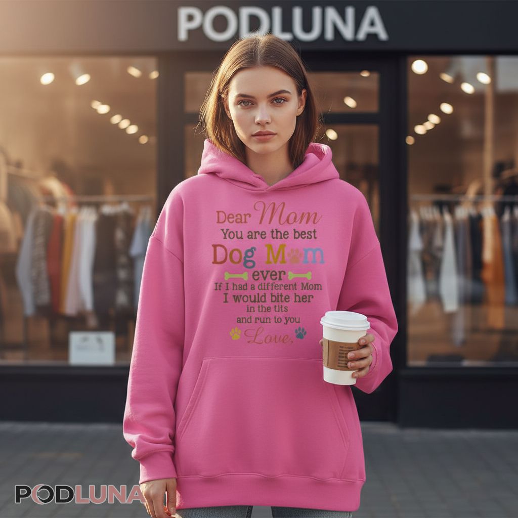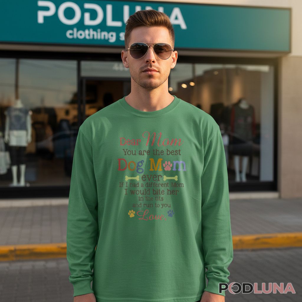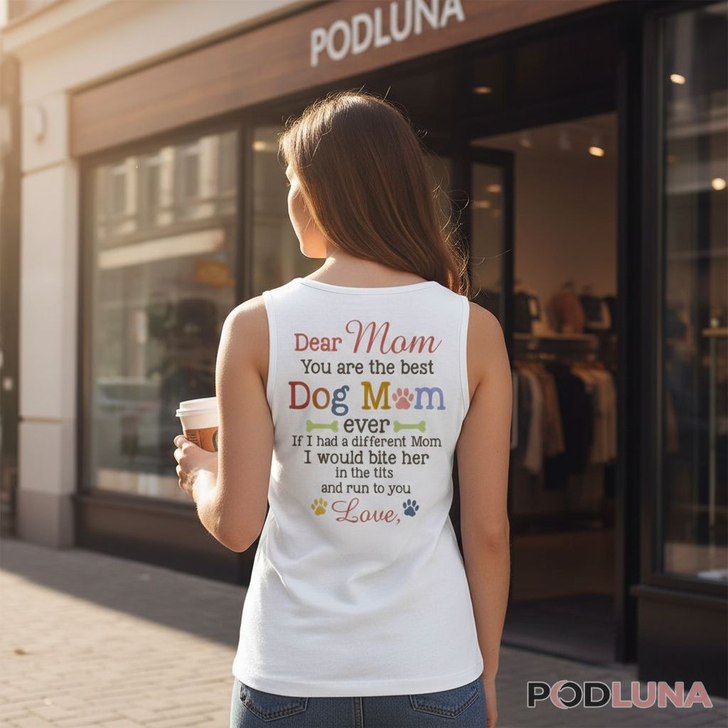 Heartfelt letter-style typography creates an endearing message on this comfortable everyday tee designed for dog moms. The composition opens with “Dear Mom” at the top in coral pink script, followed by “You are the best” in simple gray text. The phrase “Dog Mom” appears in multicolored letters—each character rendered in different hues including teal, coral, gold, and blue, with a small paw print replacing the ‘o’ in “Mom.” Below that, “ever” flows in coral script with decorative bone graphics flanking it. The humorous twist continues with “If I had a different Mom / I would bite her / in the tits / and run to you” in straightforward gray text, concluding with “Love,” in coral script alongside golden and blue paw print accents. The Best Dog Mom Ever From The Dog Pun Shirt combines sentimental messaging with cheeky humor through playful typography and pet-themed embellishments.