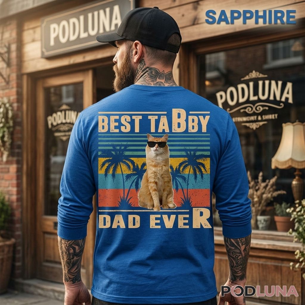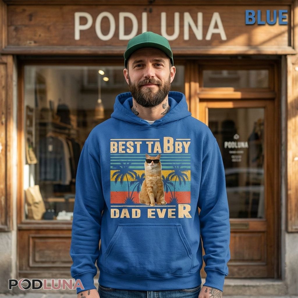 A best tabby dad shirt celebrating ginger cat fatherhood with laid-back retro summer energy. The design features a confident orange tabby cat wearing cool sunglasses sitting center stage against a layered vintage sunset panel with palm tree silhouettes flanking both sides, creating a relaxed tropical atmosphere. “BEST TABBY” leads across the top in distressed lettering with the “B” in “TABBY” cleverly enlarged to echo the word “DAD” hidden within, while “DAD EVER” anchors the bottom in matching vintage block text — a wordplay detail that rewards anyone who looks twice.