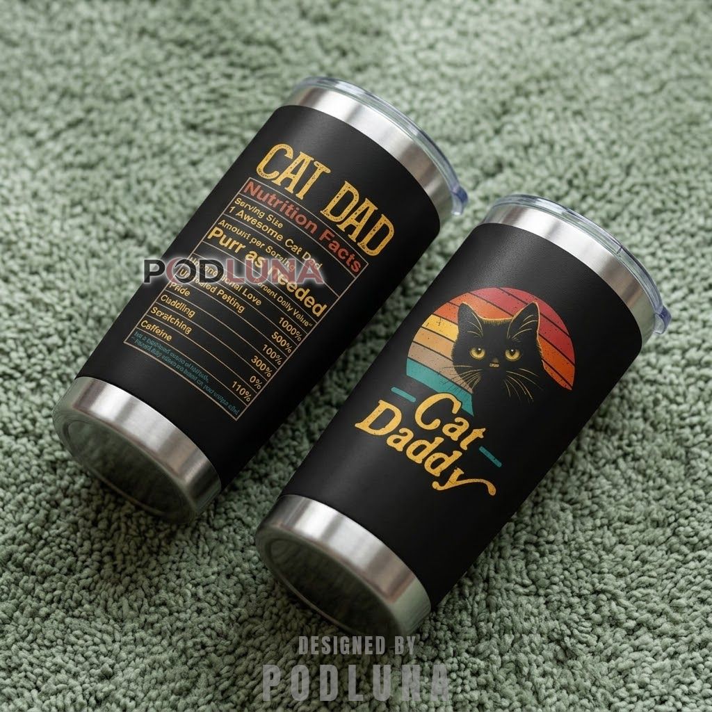 A sleek black insulated cat daddy tumbler designed for the devoted feline father in every room, this drinkware pairs a retro sunset graphic of a peeking black cat with distressed golden lettering spelling out “Cat Daddy” on one side, and a deadpan nutrition label on the other listing Unconditional Love at 1000%, Cuddling at 300%, and Caffeine at 110%. The vintage warm tones, striped horizon, and label-style layout give this funny cat dad tumbler a personality as layered as the cat who inspired it.
