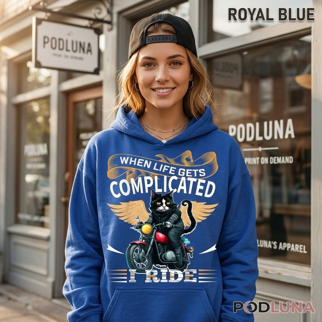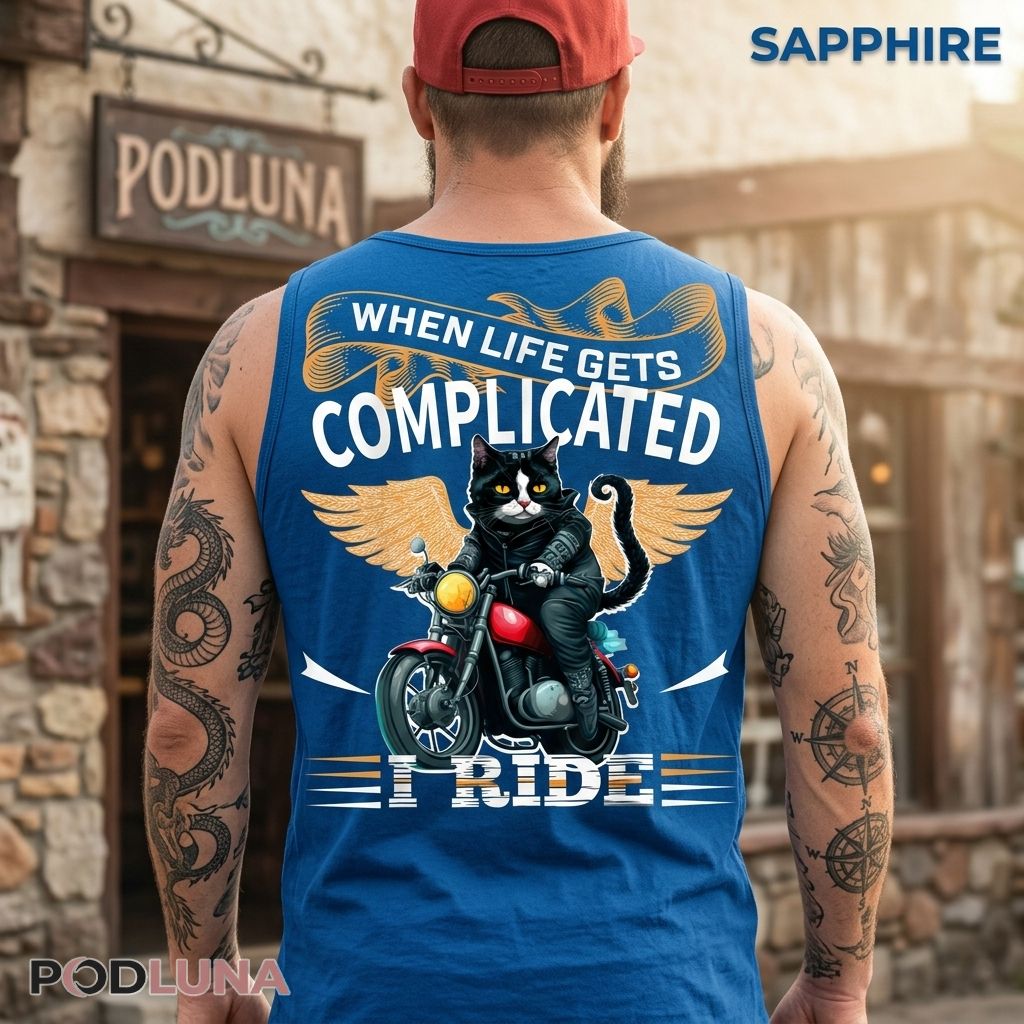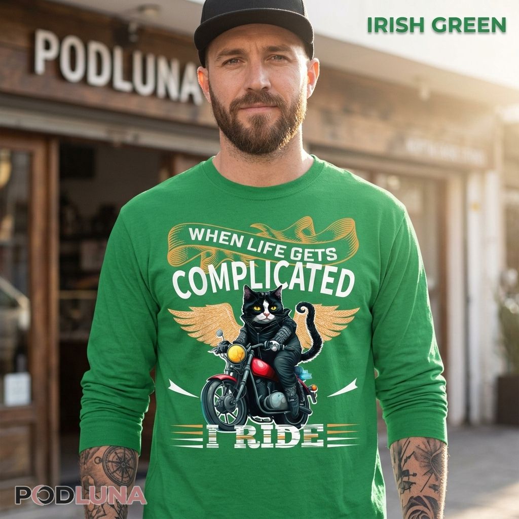 A motorcycle cat dad shirt combining two of the most liberating things in life into one bold back-print design. The design features a tuxedo cat in full leather biker gear sitting confidently astride a classic motorcycle, golden wings spread wide behind it against an ornate banner backdrop. “WHEN LIFE GETS COMPLICATED” arches across the top in decorative scroll lettering, “I RIDE” anchors the bottom in large bold text with speed line accents — the cat’s expression making it clear this is both a lifestyle choice and a coping strategy, and both are completely valid.