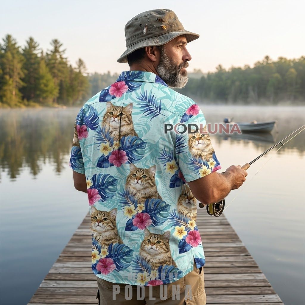 Father’s Day, a fishing morning, a summer gathering, a birthday weekend, or any warm occasion where he wants to show up wearing the cat without anyone questioning the decision all work naturally here. The light blue base keeps the tropical elements vivid and the cat photo fully readable at every repeat, which means the portrait lands with equal clarity whether someone is standing three feet away or across a dock in the morning mist. That visibility across setting and distance reflects the same design standard the Podluna custom apparel catalog brings to every all-over print piece built around a real animal photo.