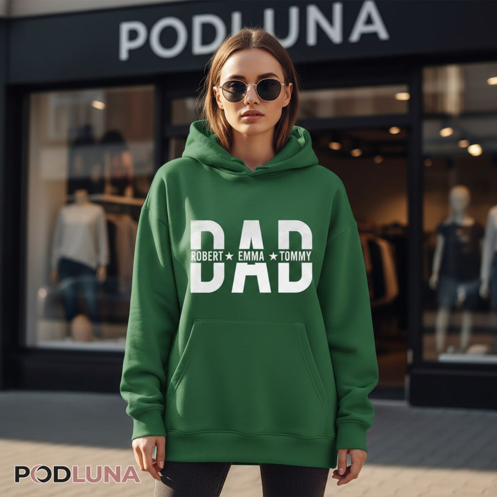 Sometimes the most meaningful designs are the ones that don’t try too hard. This tee strips fatherhood down to its essentials: the title “DAD” and the names of the people who gave him that identity. Podluna’s Custom Name Dad With Kids Names Vintage Shirt lets you add each child’s name, transforming a simple concept into a deeply personal piece. It’s perfect for fathers who prefer understated style over flashy graphics, guys who want to wear their family pride without elaborate imagery, and anyone looking for a versatile piece that works across casual settings. Whether he’s at weekend soccer games, running errands, or just relaxing at home, this shirt makes a statement through simplicity: these are my kids, and being their dad is my most important role.