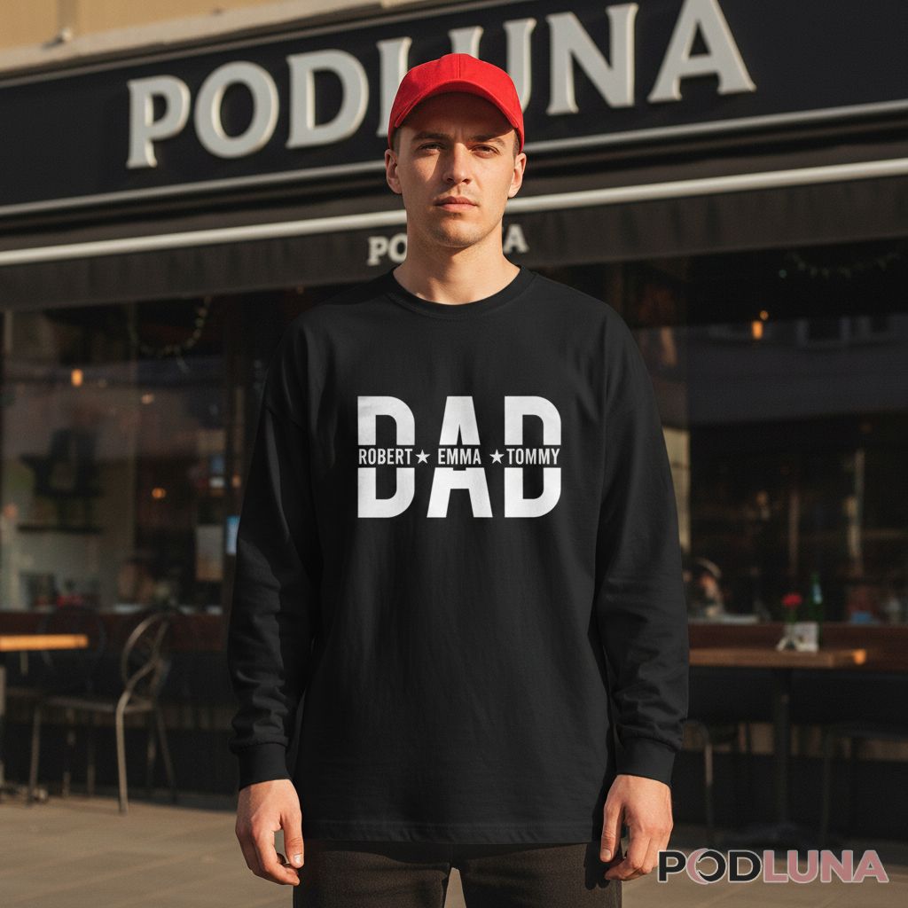 Minimalist typography dominates this t-shirt with the word “DAD” repeated twice in oversized white letters, stacked vertically to create a bold visual impact. Between the two instances of “DAD,” three customizable names appear in smaller uppercase text—”ROBERT,” “EMMA,” and “TOMMY”—separated by star symbols. The design employs a simple yet effective layering technique where the children’s names integrate seamlessly into the larger typographic structure. The entire composition uses crisp white lettering that creates strong contrast, with the oversized “DAD” text serving as both the background and foreground element. The clean, straightforward layout ensures maximum readability while maintaining a modern, uncluttered aesthetic.