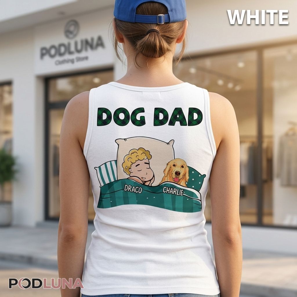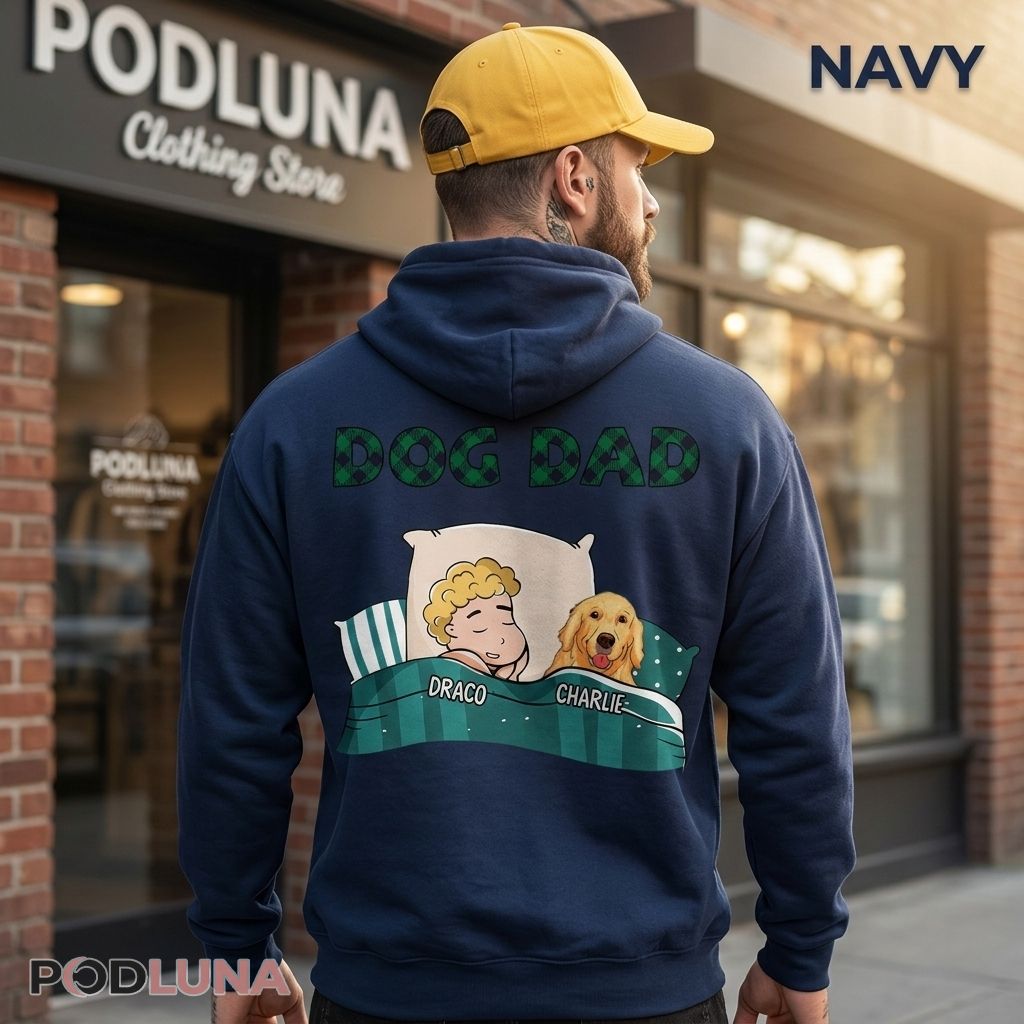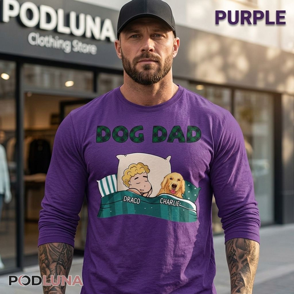 The Custom Dog Dad Sleeping shirt captures the most universally accurate portrait of dog ownership that any dog dad has ever seen on a piece of clothing. The design features a cozy cartoon illustration of a man and his golden retriever sharing a pillow side by side — both peacefully asleep, both equally comfortable, both named on the blanket edge below their figures — with “DOG DAD” displayed in bold plaid-textured lettering across the top, the whole scene radiating the specific domestic warmth of a household where the dog was never going to sleep anywhere other than the bed.