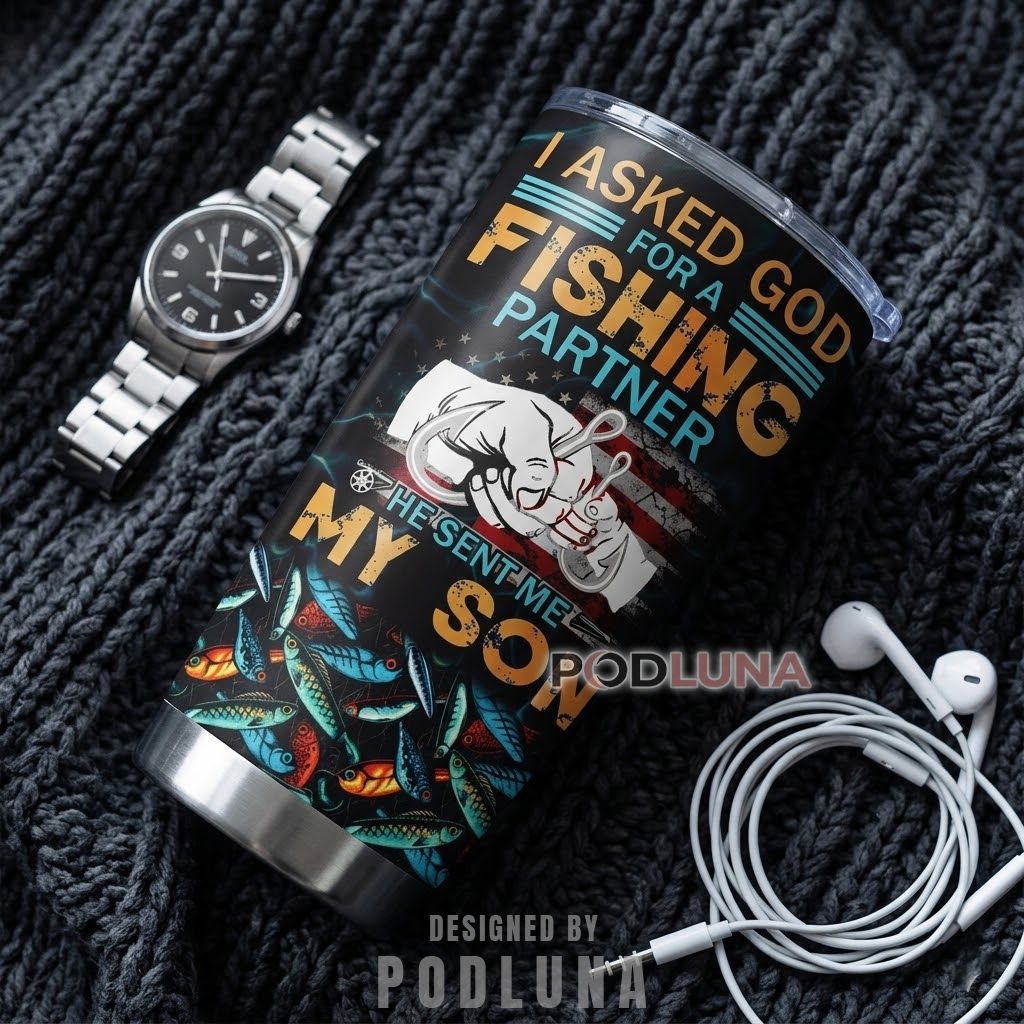 This personalized dad and son fishing tumbler wraps a bold message across a dark distressed American flag background on one side, reading “I Asked God For A Fishing Partner, He Sent Me My Son” above a fist bump graphic surrounded by illustrated fishing lures. The reverse panel opens into a warm sunset scene with two silhouettes standing side by side at the water’s edge, rods extended, with a custom name printed large across the lower half in weathered gold lettering.
