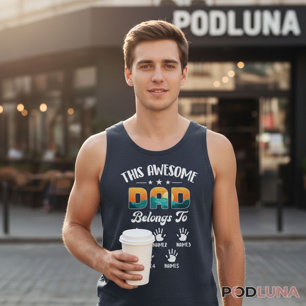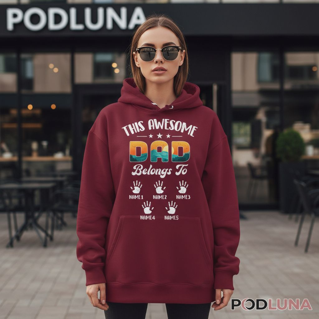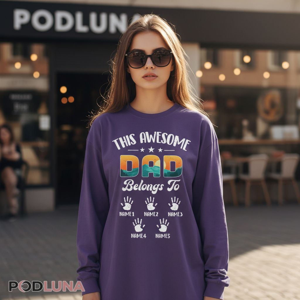 There’s something powerful about literally wearing your family’s claim on you. This design transforms dad’s identity into a visual roster, with each child represented by a handprint and name. Podluna’s Custom Name This Awesome Dad Belongs To Cotton Shirt lets you add every kid’s name, creating a complete family portrait in wearable form. It’s perfect for Father’s Day gifts from multiple children, birthday surprises that acknowledge his entire brood, or everyday wear when dad wants to showcase exactly who he belongs to. The gradient “DAD” adds visual pop while the handprints deliver sentimental weight—a combination that works whether he’s wrangling toddlers at the park or celebrating with adult children at family gatherings. Being claimed never looked so good.