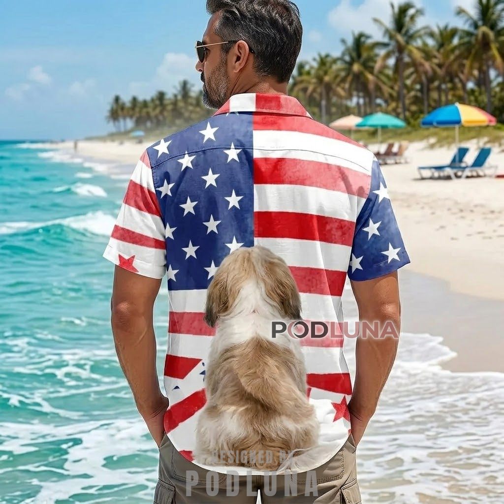 The flag format works differently here than on any standard patriotic shirt because the dog photo is not a small accent dropped into a busy pattern. It is the centerpiece. The stars and stripes exist to frame it, which means every time someone looks at the shirt they are looking at his specific dog first and everything else second. That hierarchy is exactly right. A custom dog dad shirt built around a single large portrait rather than a scattered repeat gives the photo a presence that no all-over repeat can match, and the patriotic backdrop gives it a backdrop worthy of the subject.