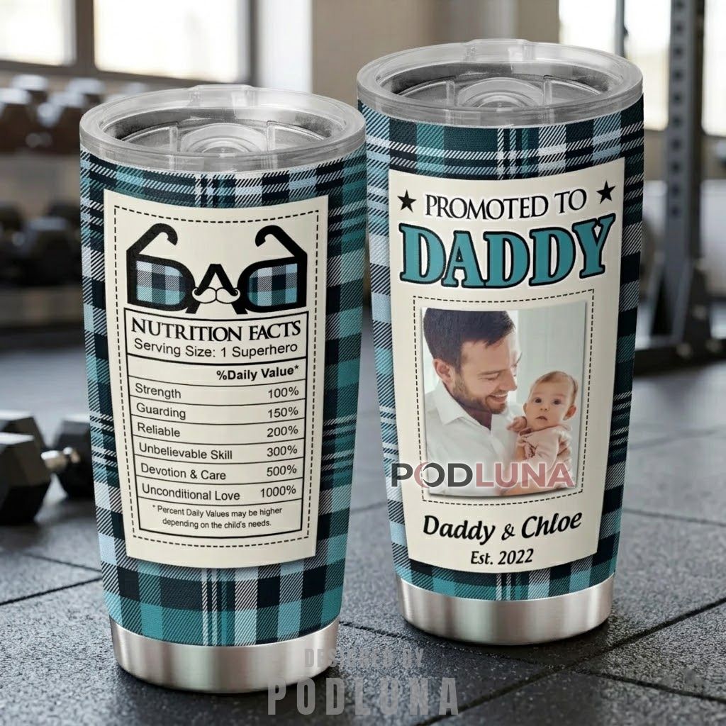 This promoted to daddy tumbler arrives with a dual-panel design that puts a custom photo of him with his newborn on one side, complete with both names and an “Est.” year, while the reverse runs a full “Nutrition Facts” label listing Strength at 100%, Devotion and Care at 500%, and Unconditional Love at 1000%, all set inside a cream label panel against a teal and black buffalo plaid wrap. The glasses-and-mustache “DAD” logo above the nutrition panel gives this new daddy gift an instantly recognizable wit without sacrificing the warmth that makes the photo side hit harder.