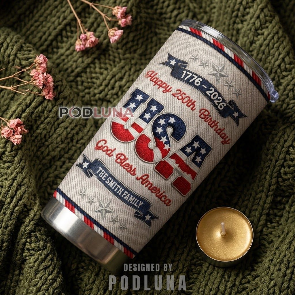 This Happy 250th Birthday USA personalized family tumbler was designed for anyone who treats America’s anniversary the way it deserves to be treated, like a birthday that belongs to the whole family, featuring a warm linen-textured full-wrap design with “1776-2026” in a dark banner at the top, “Happy 250th Birthday” in festive red script, oversized embroidered-style “USA” lettering in stars and stripes filling the center, “God Bless America” in elegant script below, and a custom family name displayed in a navy ribbon banner at the base, all framed by rope borders and silver stars in a composition that feels like a family keepsake rather than standard drinkware. The warm neutral texture and celebratory layout make this America 250th anniversary personalized family tumbler the most inviting commemorative gift of the milestone year.
