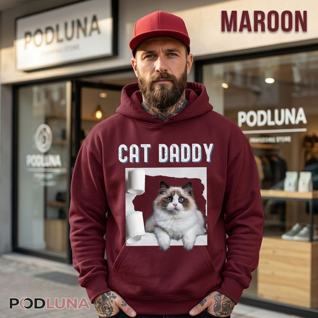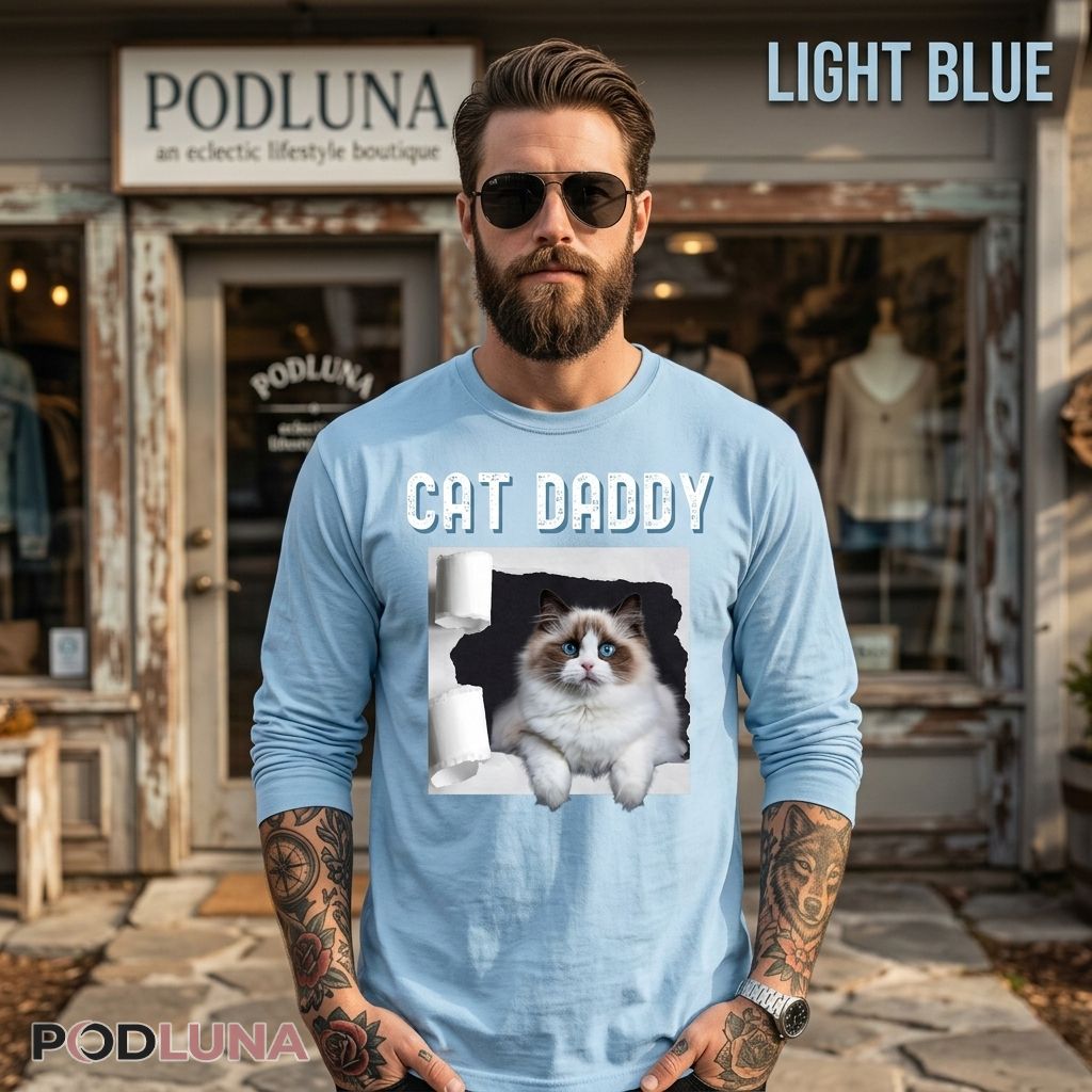For the cat daddy who has stopped buying toilet paper in single rolls because his ragdoll has made the economics of that decision completely unsustainable — who comes home to a bathroom that looks like a confetti factory and a cat with blue eyes so innocent it is impossible to stay frustrated for more than three seconds — this shirt is the documentation of daily life with a ragdoll and the cat daddy who adores every chaotic moment of it. Podluna captured that specific ragdoll energy in a design that every fluffy cat parent will recognize as their own Tuesday afternoon. The perfect ragdoll cat daddy gift for Father’s Day, his birthday, or any occasion where the right present proves that whoever chose it has clearly met his cat. Wear it anywhere fellow ragdoll owners will take one look and immediately share their own toilet paper story.