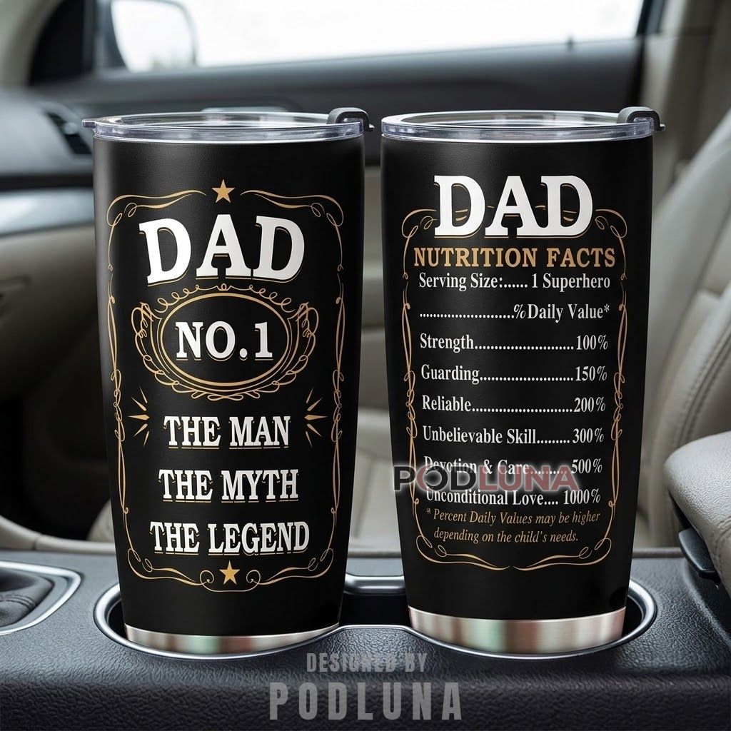 This Dad No.1 The Man The Myth The Legend tumbler was made for the father who has earned every word on both sides without ever asking for recognition, featuring a two-sided full-wrap design on matte black with gold ornamental framing, one side presenting “Dad No.1 The Man The Myth The Legend” in bold stacked lettering inside a whiskey-label inspired border with gold star accents, and the other delivering a Dad Nutrition Facts label listing serving size as “1 Superhero” with Strength at 100%, Guarding at 150%, Reliable at 200%, Unbelievable Skill at 300%, Devotion and Care at 500%, and Unconditional Love at 1000%, with the footnote “Percent Daily Values may be higher depending on the child’s needs.” The gold-on-black aesthetic and dual-concept execution make this Father’s Day tumbler one of the most complete tributes in the category.