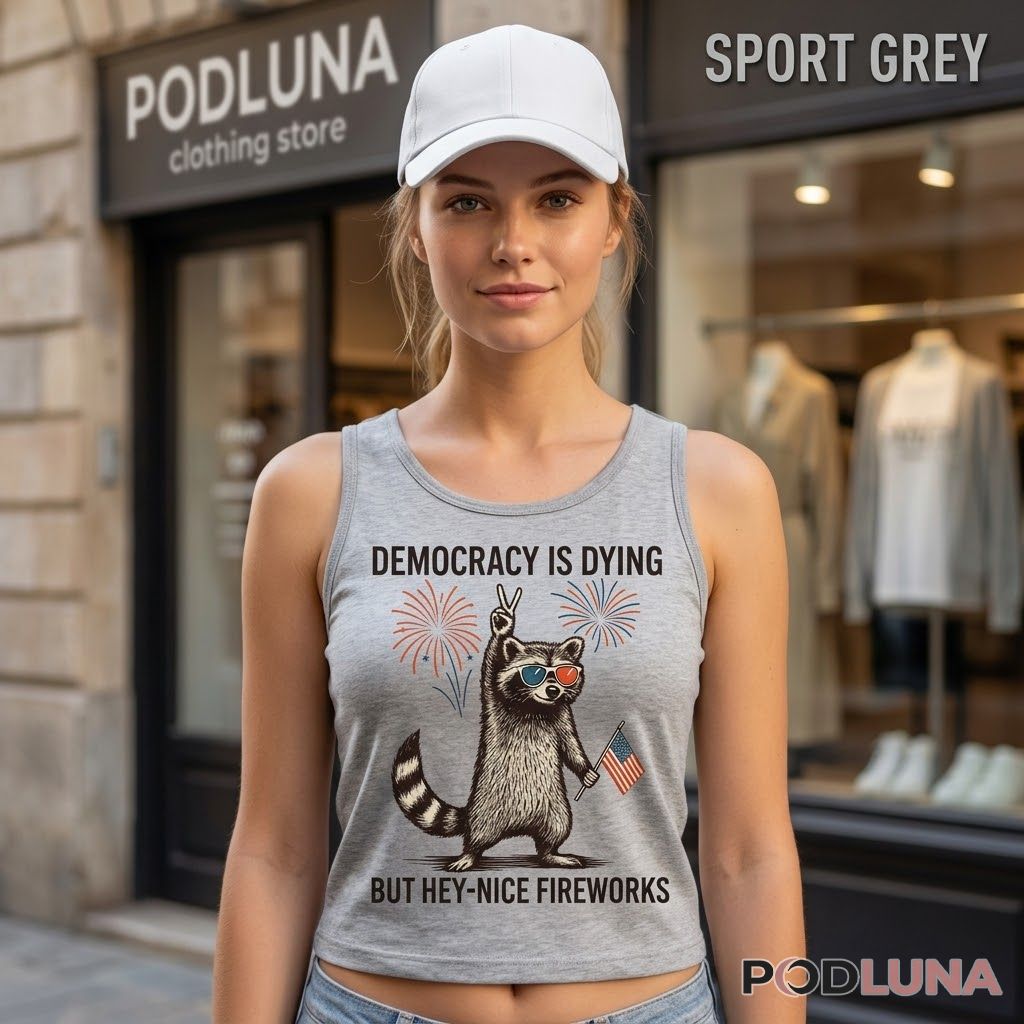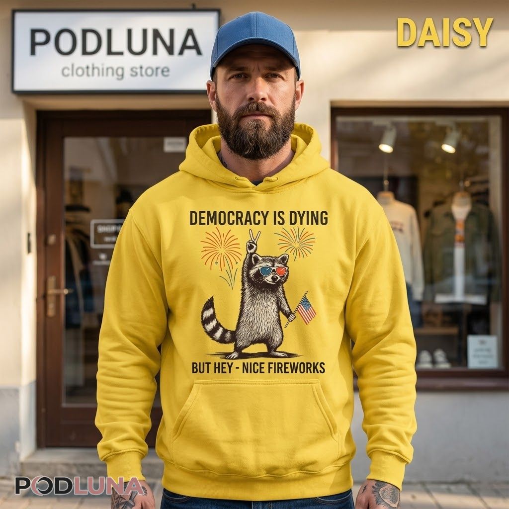 This Democracy Is Dying But Hey Nice Fireworks political humor shirt was made for the person who follows the news closely enough to need a shirt that acknowledges it, featuring a detailed vintage-style illustrated raccoon in red-tinted sunglasses holding a small American flag and throwing a peace sign while colorful fireworks burst on either side, framed by clean serif typography that delivers the setup above and the punchline below with the timing of someone who has been saving that joke all week. The earthy illustration style and editorial confidence make this 4th of July political graphic tee feel like it came from a place of genuine wit rather than manufactured controversy.