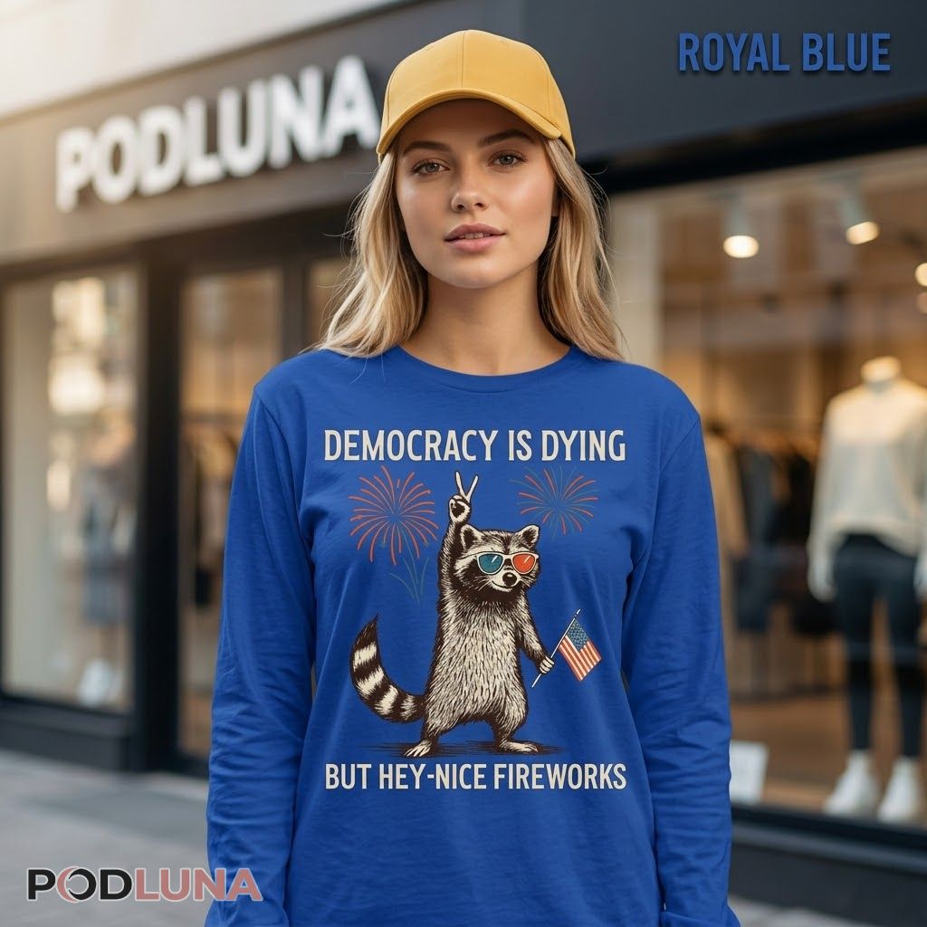 This democracy raccoon shirt belongs at every July 4th cookout, rooftop gathering, and neighborhood celebration where the dress code includes having a personality and the self-awareness to laugh at the moment you’re living in. It pairs with anything casual and carries the quiet authority of a person who came to have a good time and brought their context with them. Comfortable, clever, and impossible to misread.