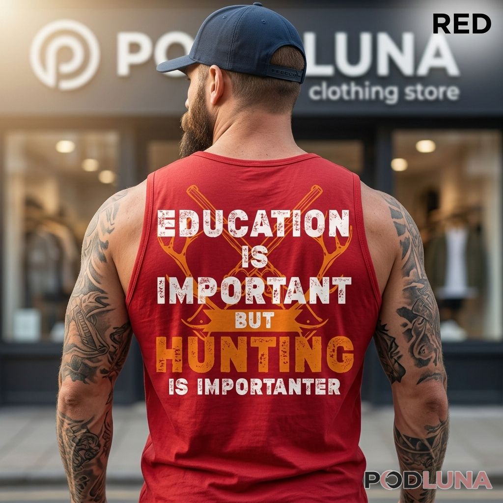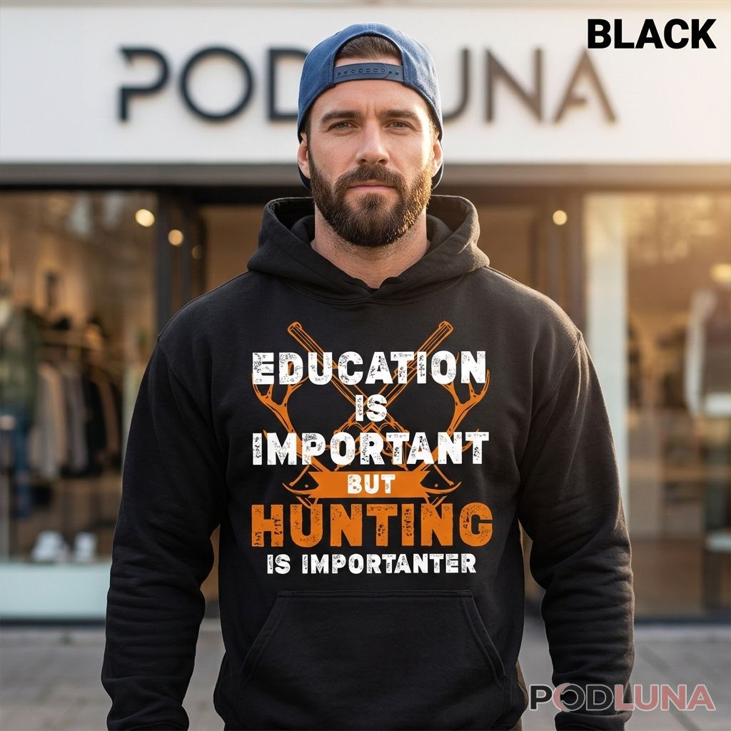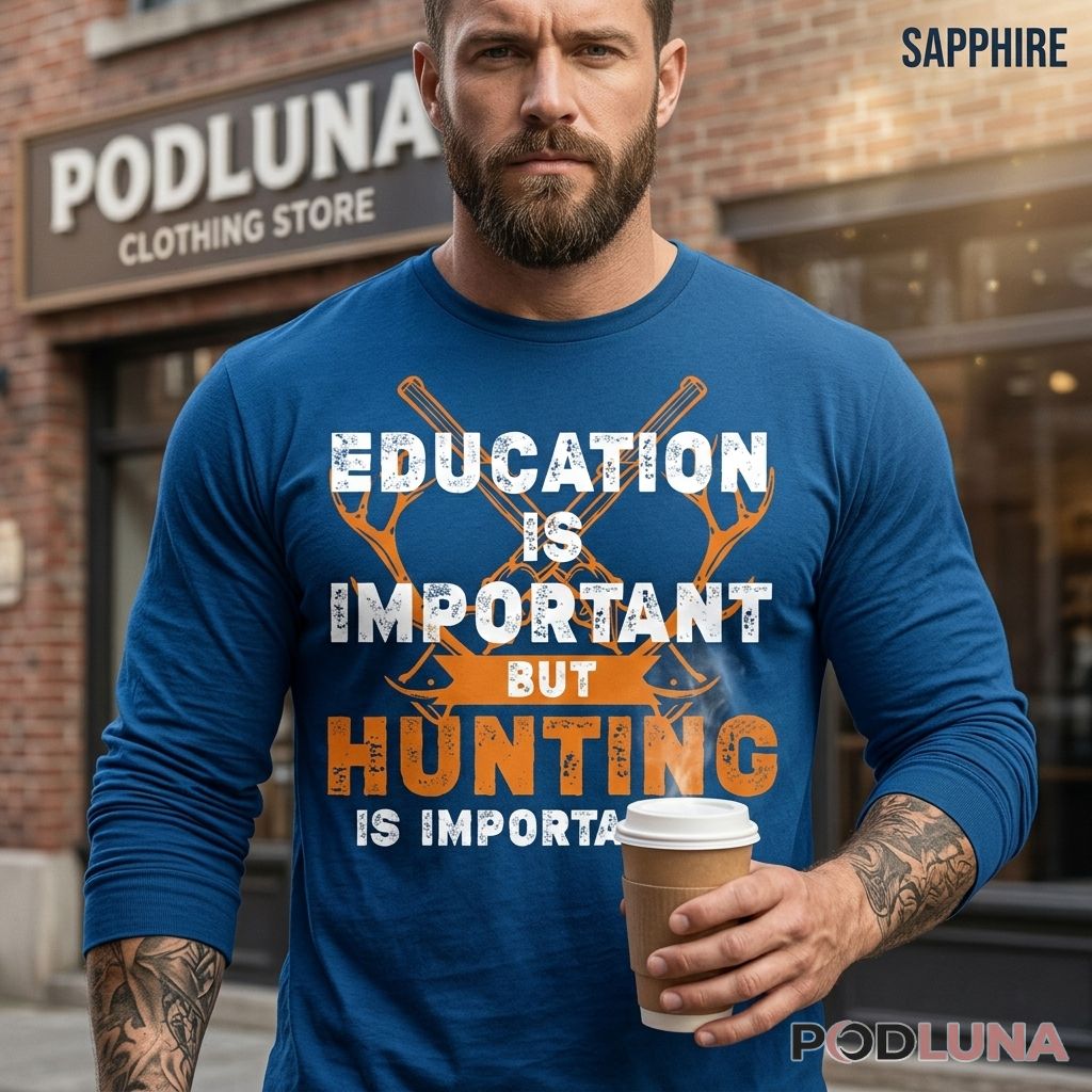 A funny hunting dad shirt delivering the classic outdoorsman’s take on priorities with bold humor. The design features two crossed rifles above a set of deer antlers forming a natural centerpiece, with the full declaration laid out in large distressed lettering: “EDUCATION IS IMPORTANT BUT HUNTING IS IMPORTANTER” — the deliberate grammatical joke landing exactly as intended, making every hunter who reads it immediately nod in agreement.