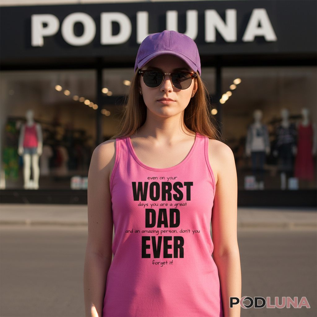 Featuring an uplifting message arranged in a stacked text layout, this t-shirt delivers encouragement through typography alone. The design alternates between bold, oversized words and smaller, script-style phrases to create visual rhythm. “WORST,” “DAD,” and “EVER” appear in large black letters that immediately catch the eye, while connecting phrases like “even on your,” “days you are a great,” “and an amazing person, don’t you,” and “forget it!” appear in smaller, handwritten-style font. This contrast between bold statements and intimate asides creates a conversational tone that reads almost like a personal note. The text-only composition relies entirely on font variation and strategic spacing to convey its heartfelt sentiment.