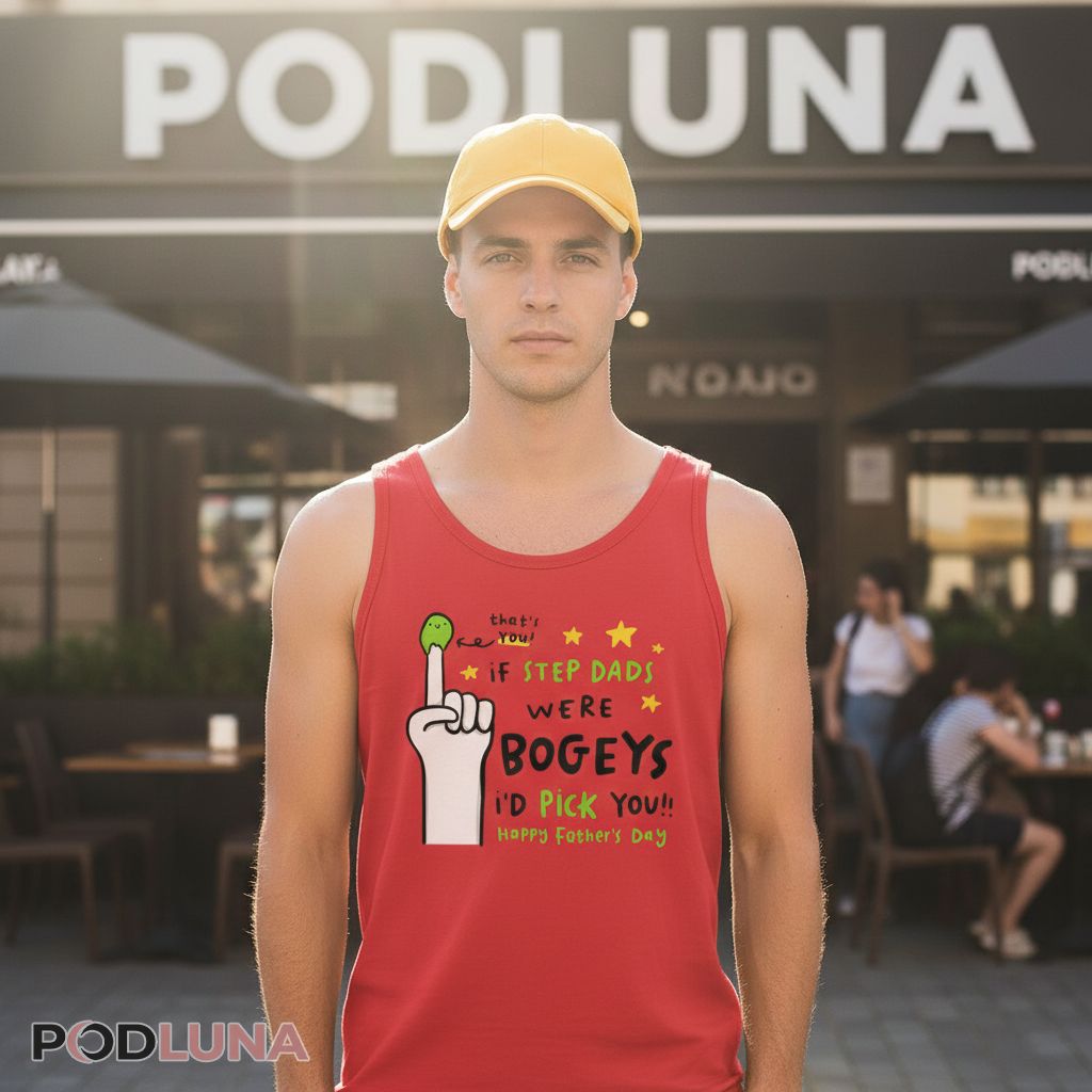 Playful humor fills this t-shirt with a quirky illustration and handwritten-style text. A cartoon finger with a smiling green face at the tip points upward on the left side, establishing the visual pun. To the right, text reads “that’s YOU!” with an arrow pointing to the finger, followed by “if STEP DADS were BOGEYS I’d PICK YOU!!” in mixed-case lettering. The message uses varying colors—green for key words like “STEP DADS” and “PICK,” black for “BOGEYS,” creating visual emphasis throughout. Small yellow stars scatter around the text, adding celebratory energy. “Happy Father’s Day” completes the message at the bottom in smaller script. The design combines the wordplay of “pick” (choosing/selecting and the other meaning) with silly kid humor to create an affectionate yet ridiculous Father’s Day tribute specifically for stepdads.