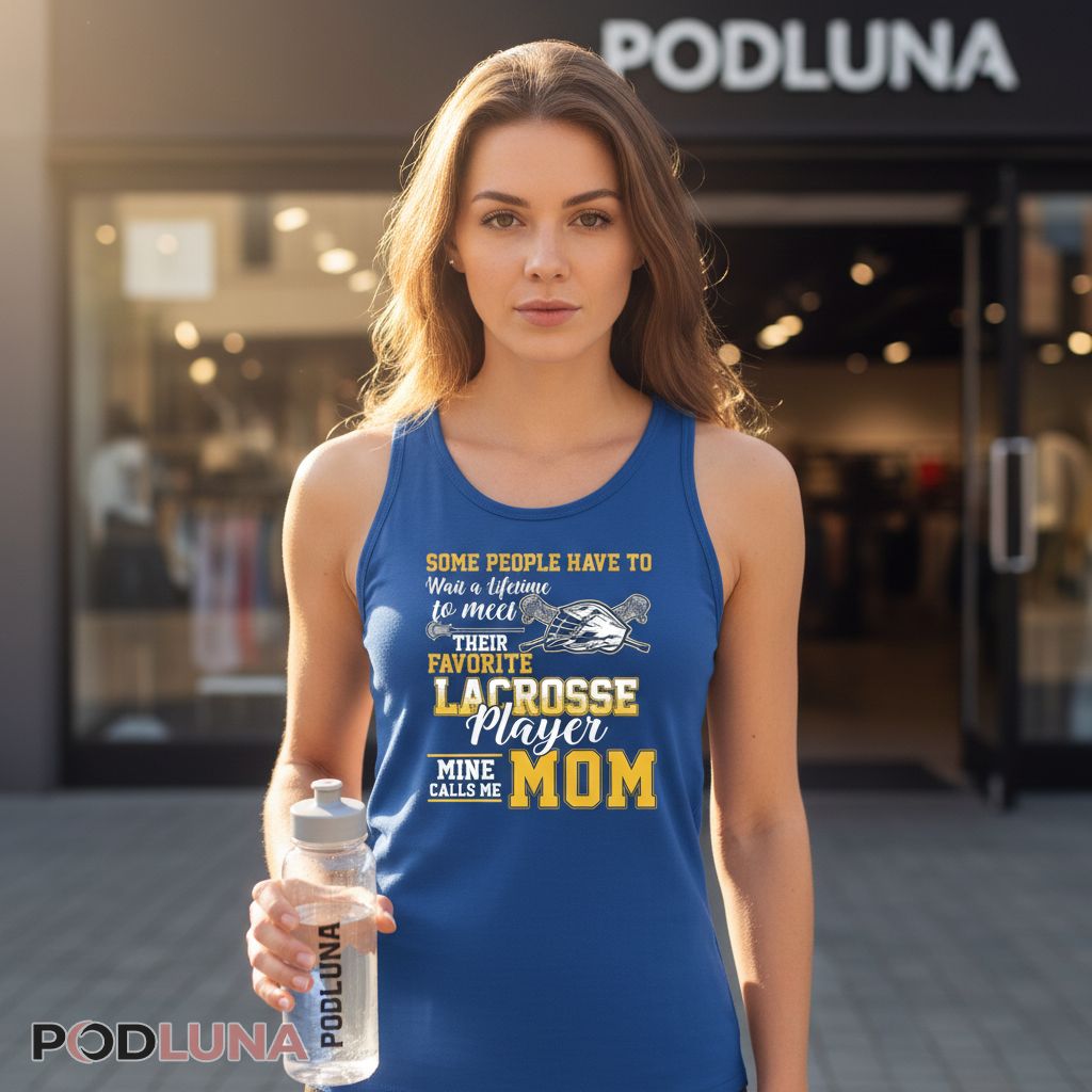 Mixed typography and lacrosse imagery create this heartwarming t-shirt celebrating the special bond between mothers and their lacrosse players. The phrase “SOME PEOPLE HAVE TO” appears at the top in golden yellow block letters. “Wait a lifetime” follows in white script, leading to “to meet” in matching script style. A lacrosse helmet illustration sits prominently in gray tones, showing protective face mask and equipment details. “THEIR FAVORITE” continues in white and golden yellow uppercase text. “LACROSSE” dominates in large golden yellow block letters with distressed texture, followed by “Player” in flowing white script. Below, “MINE CALLS ME” appears in smaller white text, concluding with “MOM” in oversized golden yellow letters. The design stacks vertically, mixing script elegance with bold block typography while golden yellow accents create warmth throughout.