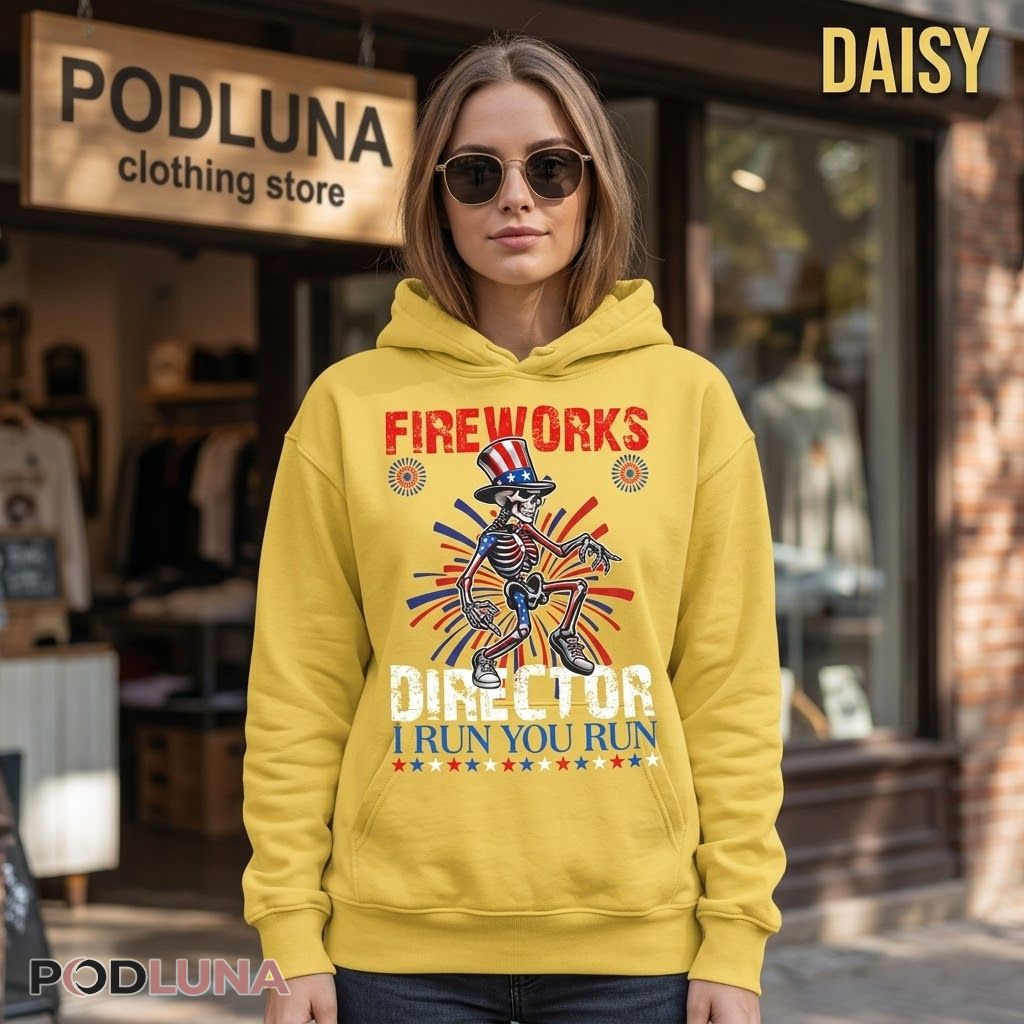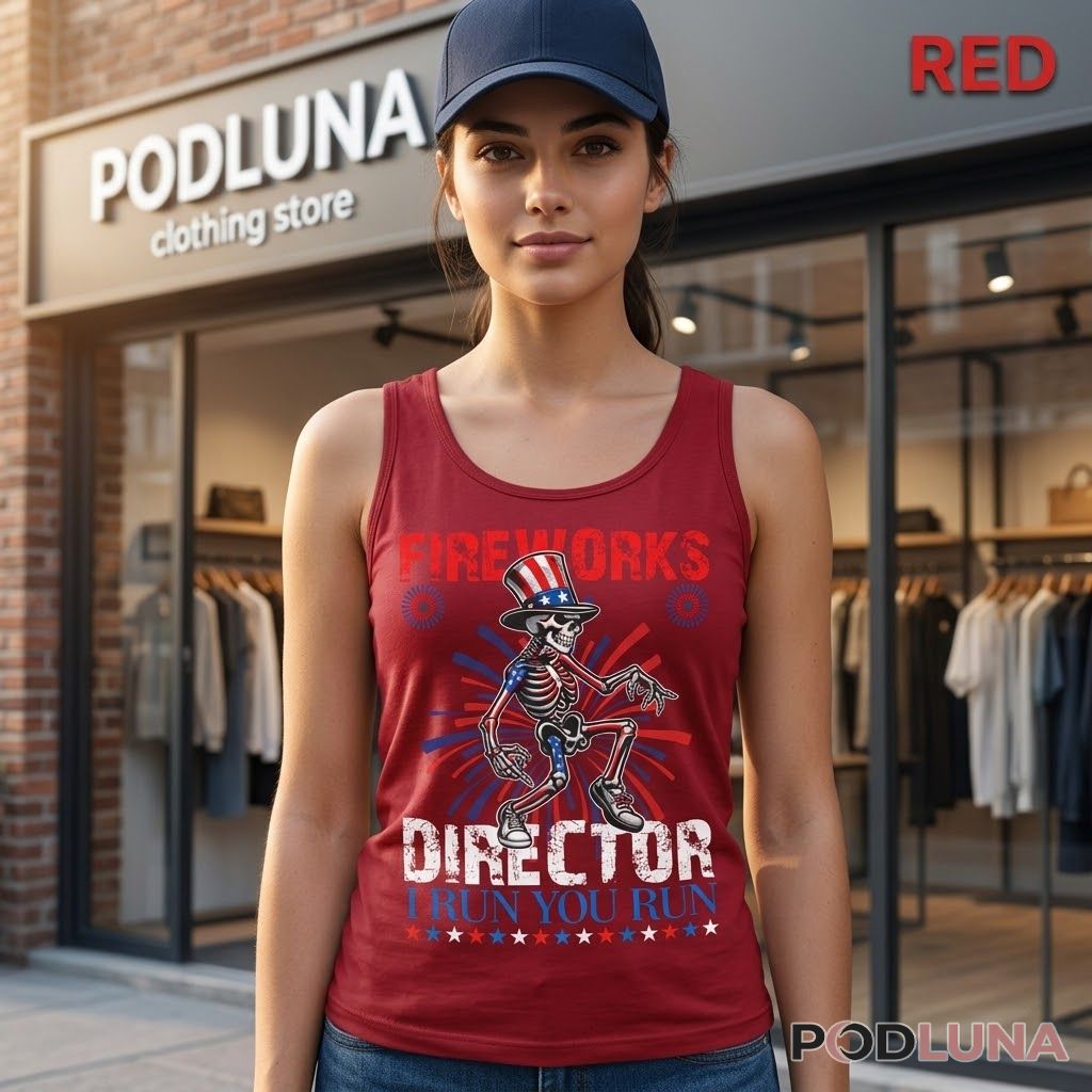 This Fireworks Director I Run You Run funny 4th of July shirt was built for the person who self-appointed to the most important role at every Independence Day gathering and has absolutely no regrets about it, featuring a dancing skeleton in an Uncle Sam top hat striking a confident pointing pose at the center of a starburst of red, white, and blue firework rays, surrounded by bold distressed typography reading “Fireworks Director” above and “I Run You Run” below a row of patriotic stars. The skeleton’s unbothered energy and the unofficial job title make this fireworks humor graphic tee the most accurate shirt at any backyard celebration.