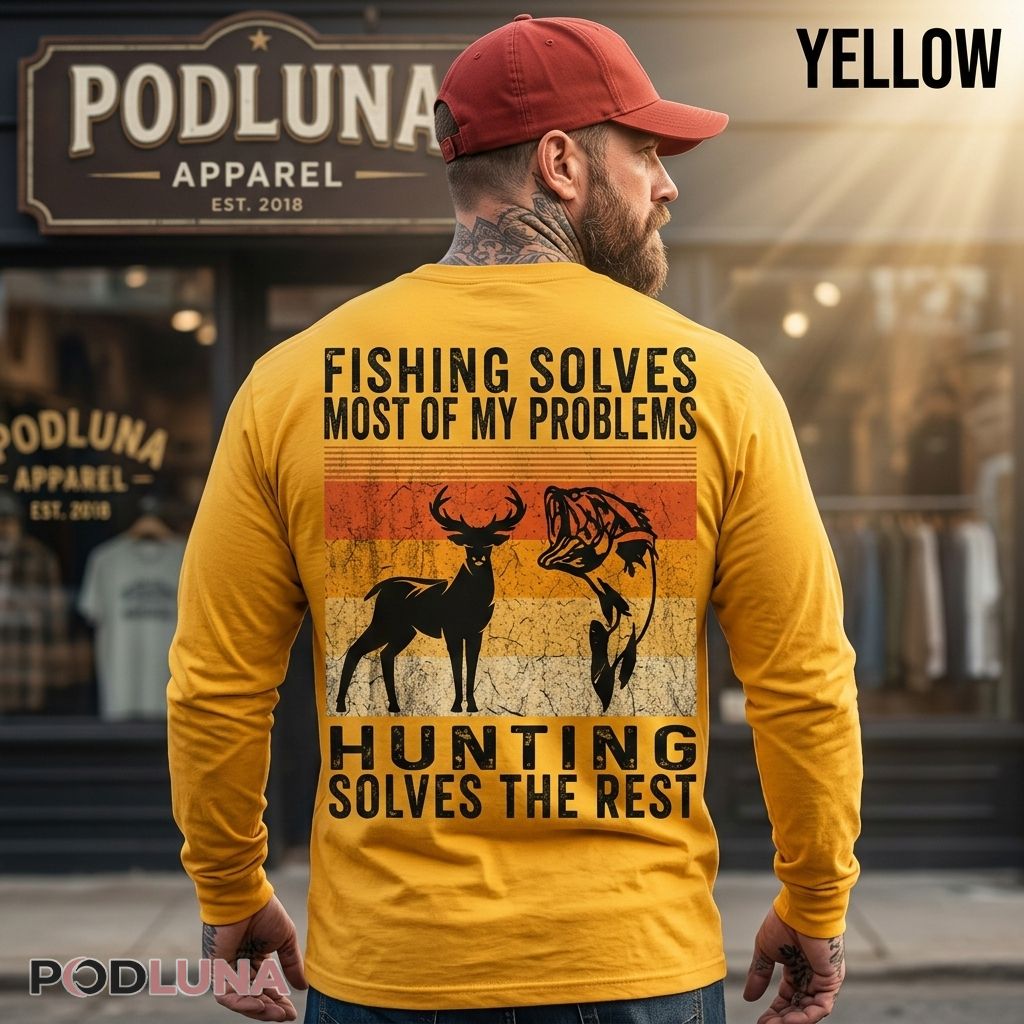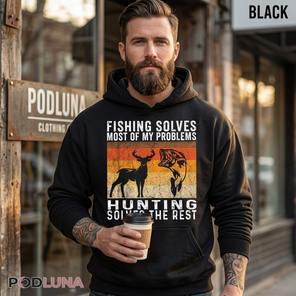 For the dad whose answer to stress, bad days, and everything in between is either a fishing rod or a rifle — this shirt explains his entire life strategy with zero apology. Therapy is fine, but fishing solves most problems and hunting solves the rest, and any dad who lives by that logic deserves a shirt that says it out loud. Designed by Podluna, a gift-focused brand specializing in meaningful apparel for dads and outdoor families, this funny hunting fishing dad shirt is the gift that perfectly captures how an outdoorsman dad processes the world. The ideal funny fishing gift for dad or hunting gift for dad on Father’s Day, his birthday, or any occasion where the right present is one that makes him laugh and reach for his gear bag. Wear it to the lake, the deer stand, the backyard cookout, or anywhere fellow hunters and anglers will immediately recognize a man who has his problem-solving priorities in perfect order.