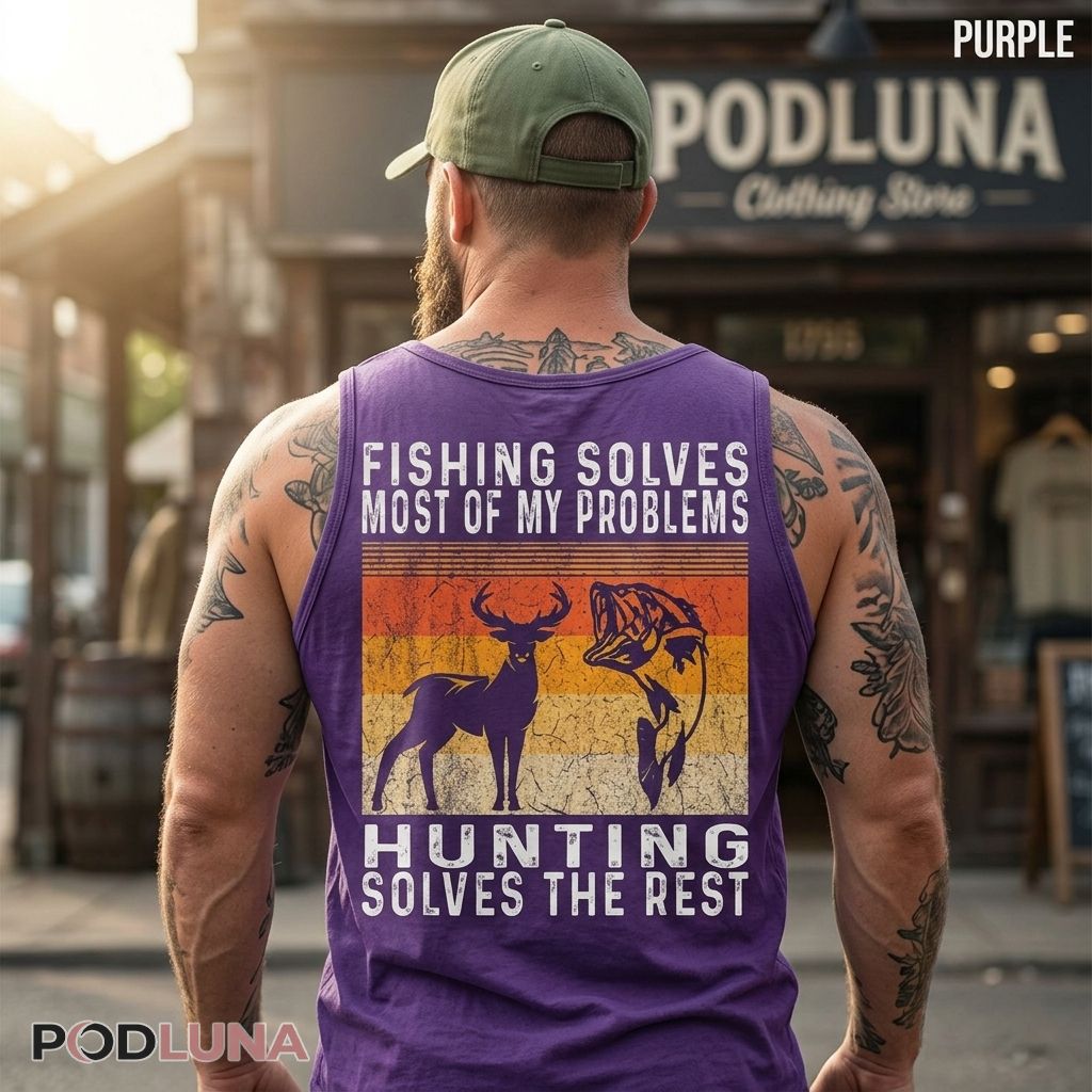 A funny hunting and fishing dad shirt that nails the outdoor lifestyle philosophy in two straight lines. The design features a retro vintage sunset panel in layered warm tones with a whitetail buck silhouette on the left and a largemouth bass leaping on the right, rendered in a classic faded style. “FISHING SOLVES MOST OF MY PROBLEMS” runs across the top in bold distressed lettering, while “HUNTING SOLVES THE REST” anchors the bottom — together delivering the complete problem-solving system of every serious outdoorsman dad.