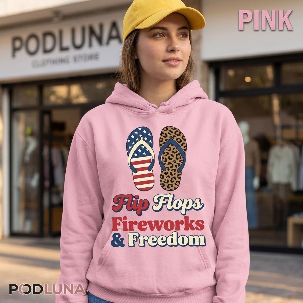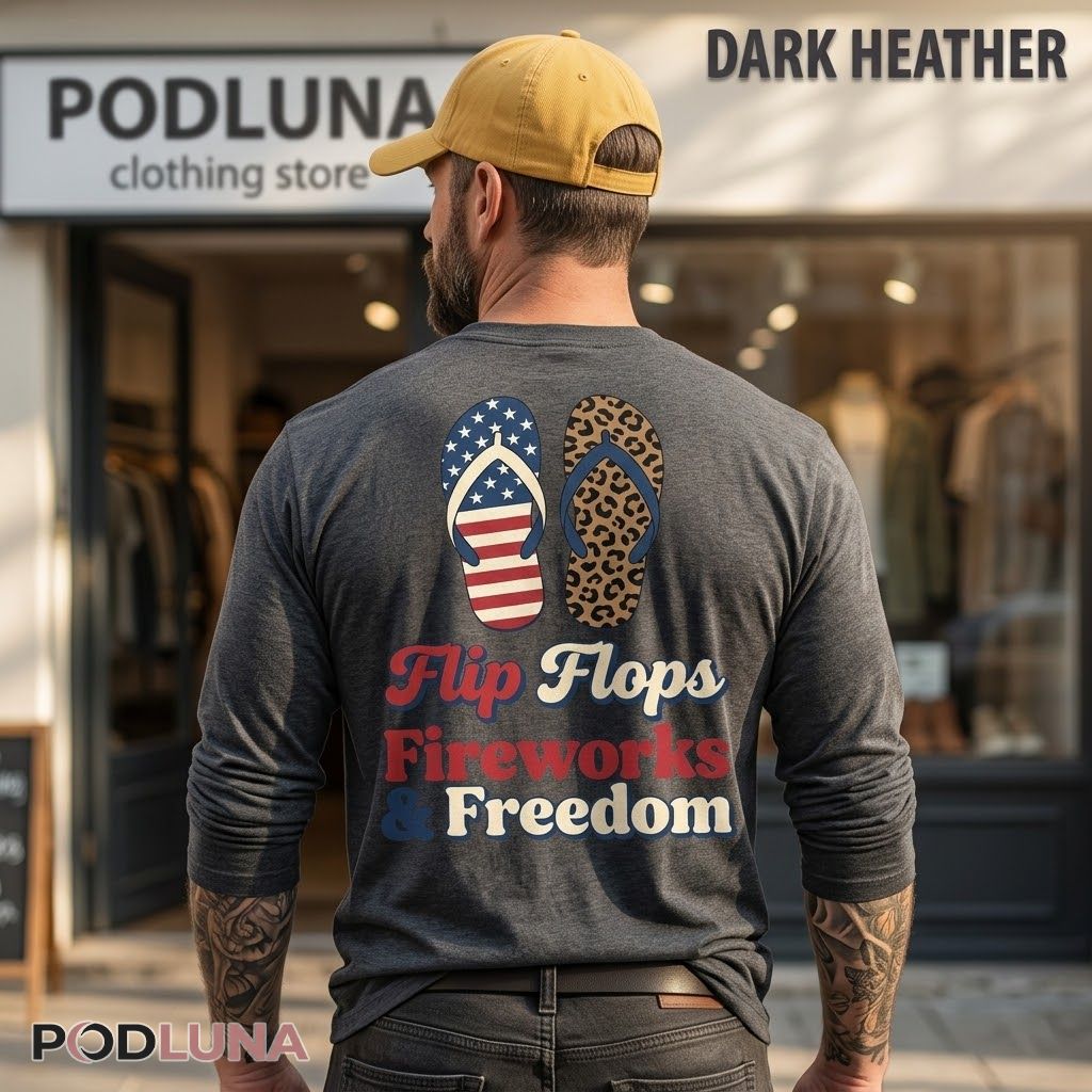 This Flip Flops Fireworks and Freedom shirt belongs at beach cookouts, pool parties, lake days, and any Fourth of July gathering where the footwear is as festive as the fireworks. It pairs with denim shorts, a flowy skirt, or anything that signals summer came first and the holiday was a happy bonus. The retro lettering style keeps it feeling fresh well past the holiday weekend.