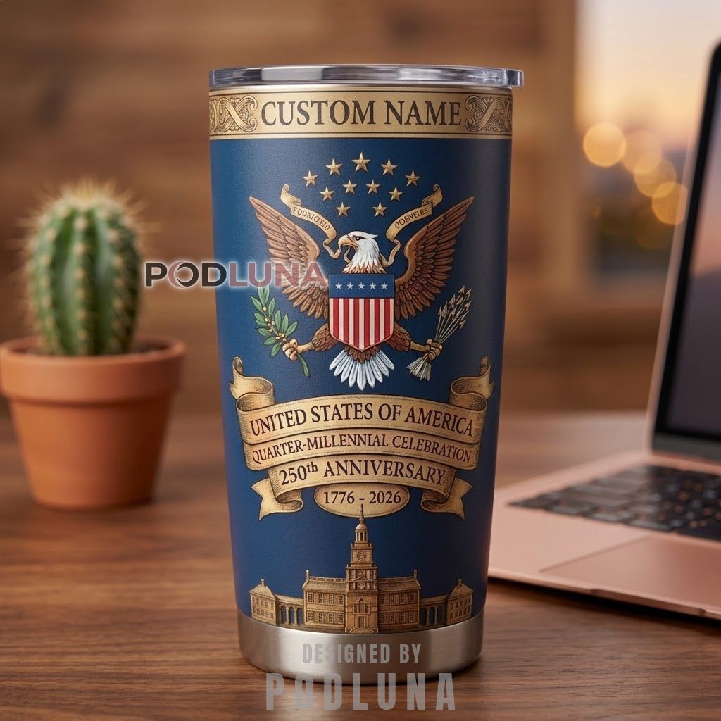 The word “semiquincentennial” exists because 250 years is not just an anniversary, it is a category of milestone so rare that it required its own terminology. This tumbler uses the equally precise “Quarter-Millennial Celebration” language, which signals immediately that the person holding it understands the full weight of the occasion. The Great Seal above Independence Hall on deep navy with a custom name at the top is the visual equivalent of an official commemorative issuance, and that is precisely the register this piece operates in. Podluna designed this formal patriotic anniversary tumbler for the person whose appreciation for American history is as precise as the engraving that represents it.