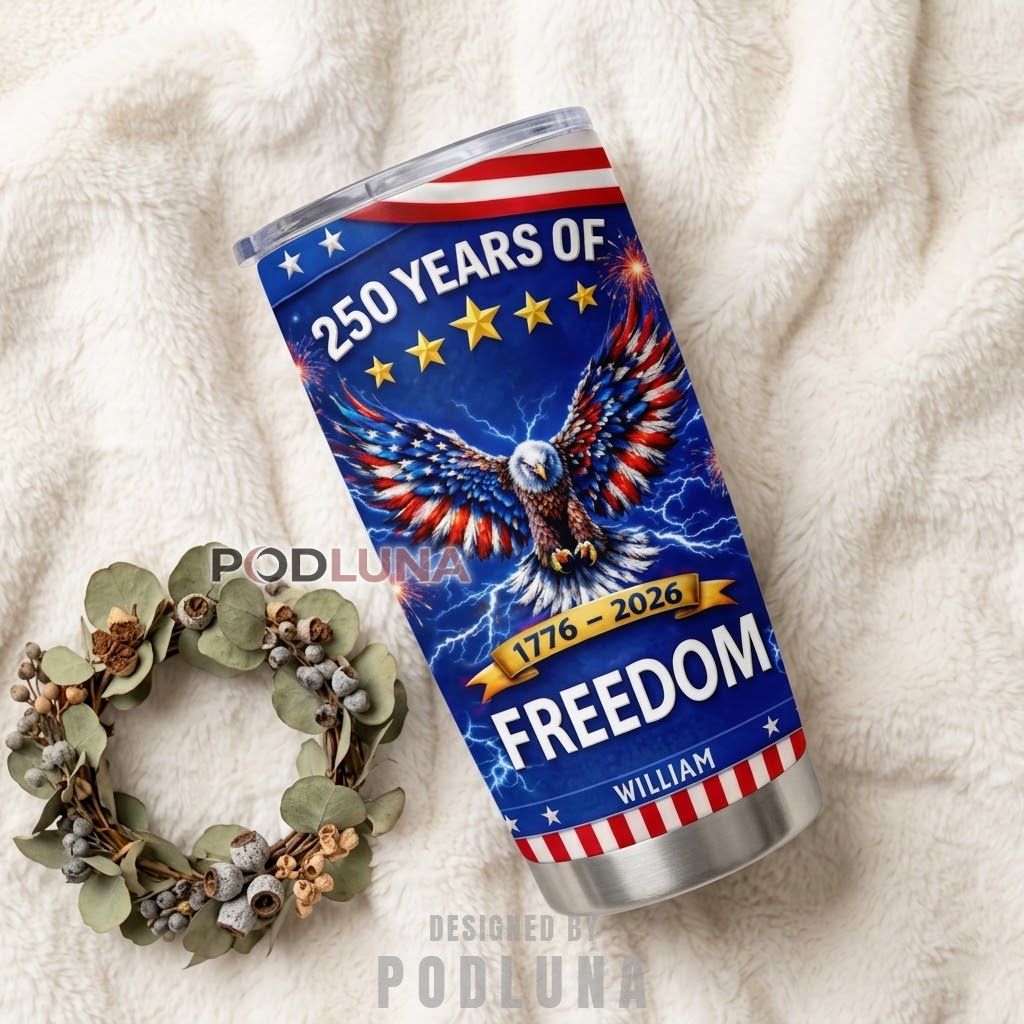 This is not a quiet tumbler. The eagle is not perched or posed, it is descending through electricity toward the word “Freedom” like the anniversary itself demanded a dramatic entrance on your desk. The blue lightning surrounding every feather is not decoration, it is the visual equivalent of what 250 years of independence actually feels like when you stop and let the number land. Podluna built this electric patriotic personalized tumbler for the person who starts every day with that same energy and needs their drinkware to match it.