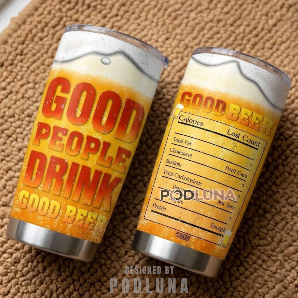 A visually immersive funny beer tumbler designed to look like a frosty pint from top to bottom, this insulated drinkware wraps a full golden beer texture complete with bubbles and foam overflow around bold gradient lettering that declares “Good People Drink Good Beer” on one side, while the other delivers a deadpan nutrition label listing Calories as “Lost Count,” Cholesterol as “Don’t Care,” and Protein as “Enough.” The amber-to-red color treatment and condensation detail make this beer lover tumbler feel less like drinkware and more like the real thing sitting in a cup holder.