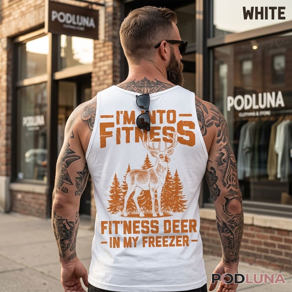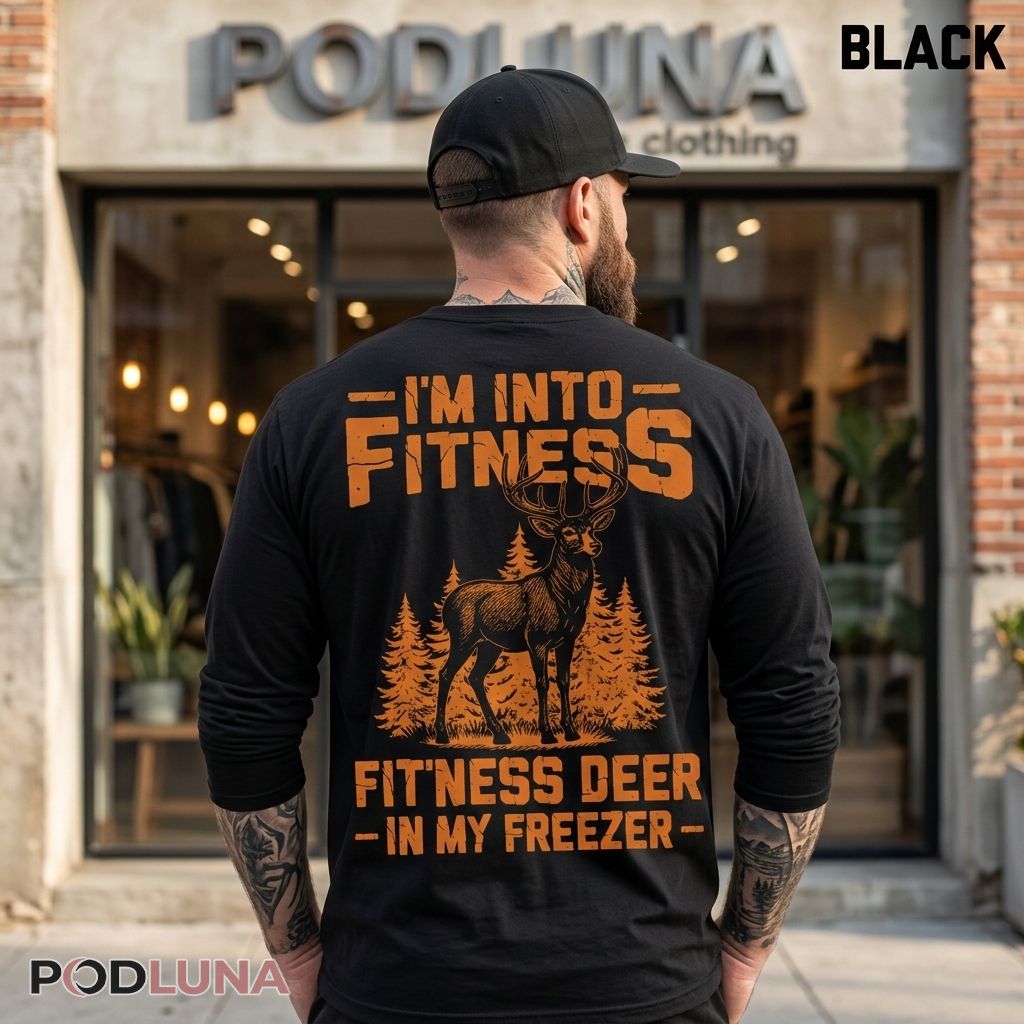 A funny deer hunting dad shirt built around the outdoorsman’s most satisfying fitness flex. The design leads with “I’M INTO FITNESS” in large bold lettering flanked by dash accents, centered above a detailed whitetail buck standing proudly among a pine forest scene rendered in a classic vintage illustration style. Below the buck, “FIT’NESS DEER IN MY FREEZER” delivers the punchline with dash separators on each side — the wordplay hitting harder framed by that proud, full-rack whitetail staring back at whoever’s reading it.