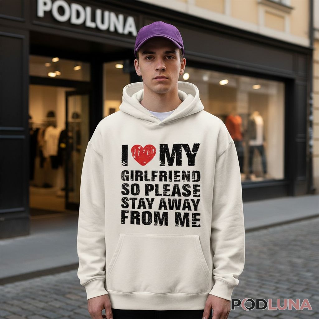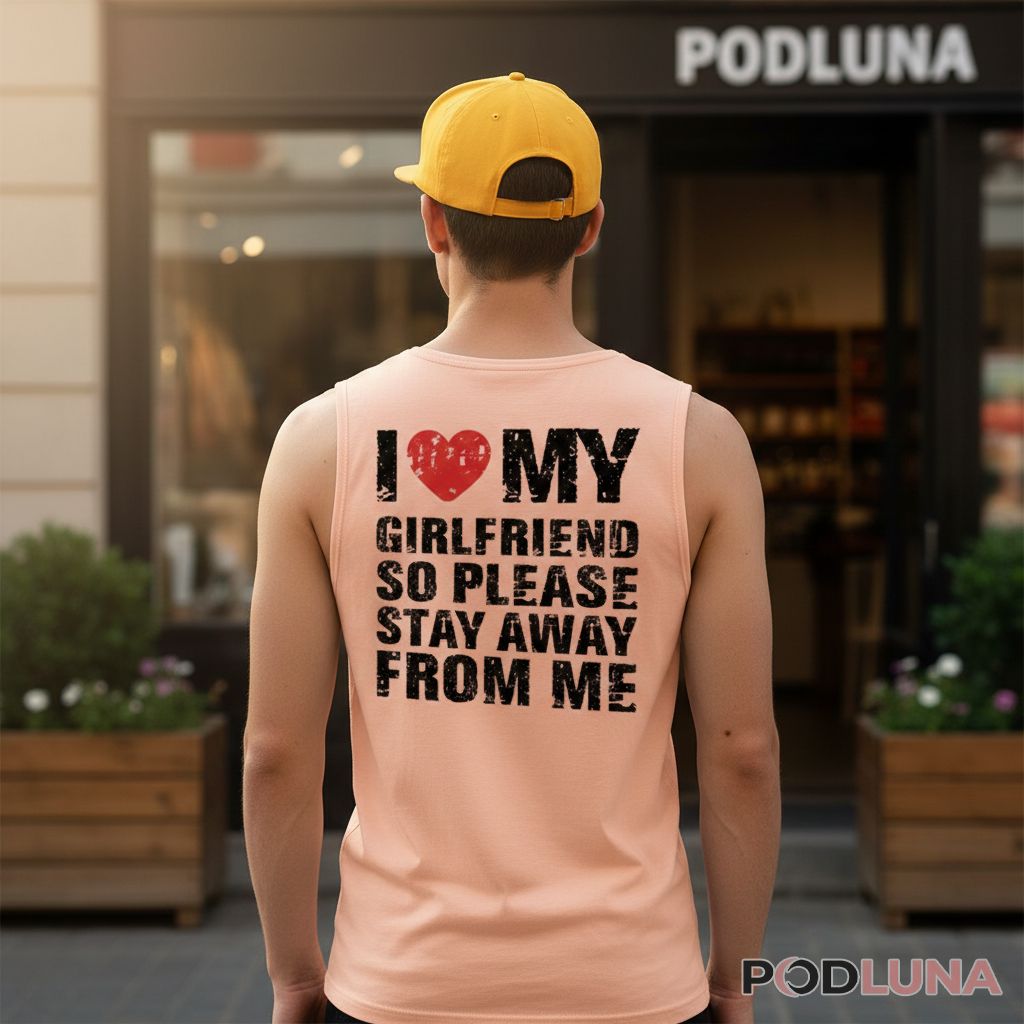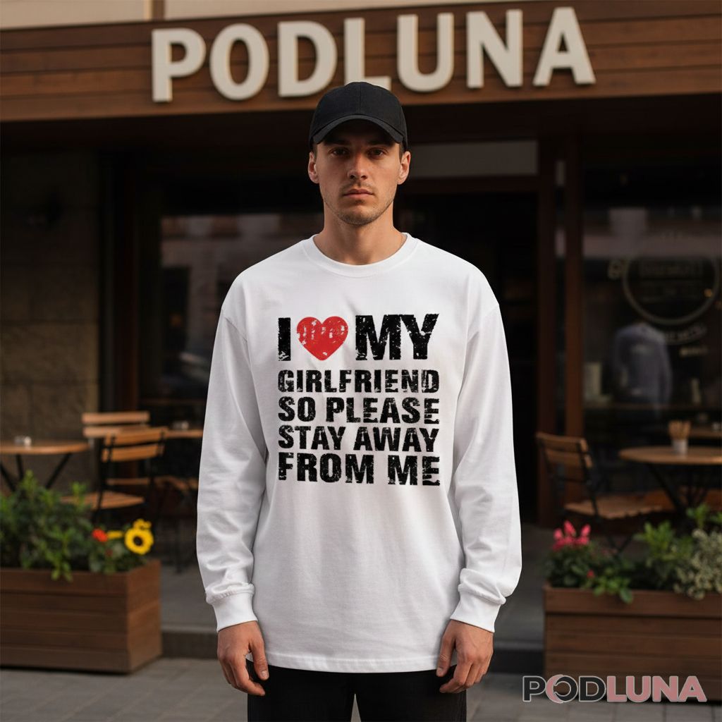 Boyfriends who want to shut down unwanted attention need humor that does the talking for them. This I Love My Girlfriend So Please Stay Away From Me shirt delivers that message with bold black typography and a red heart graphic against rich color options. The playful warning combines relationship pride with boundary-setting, perfect for guys tired of being approached when they’re already happily taken.