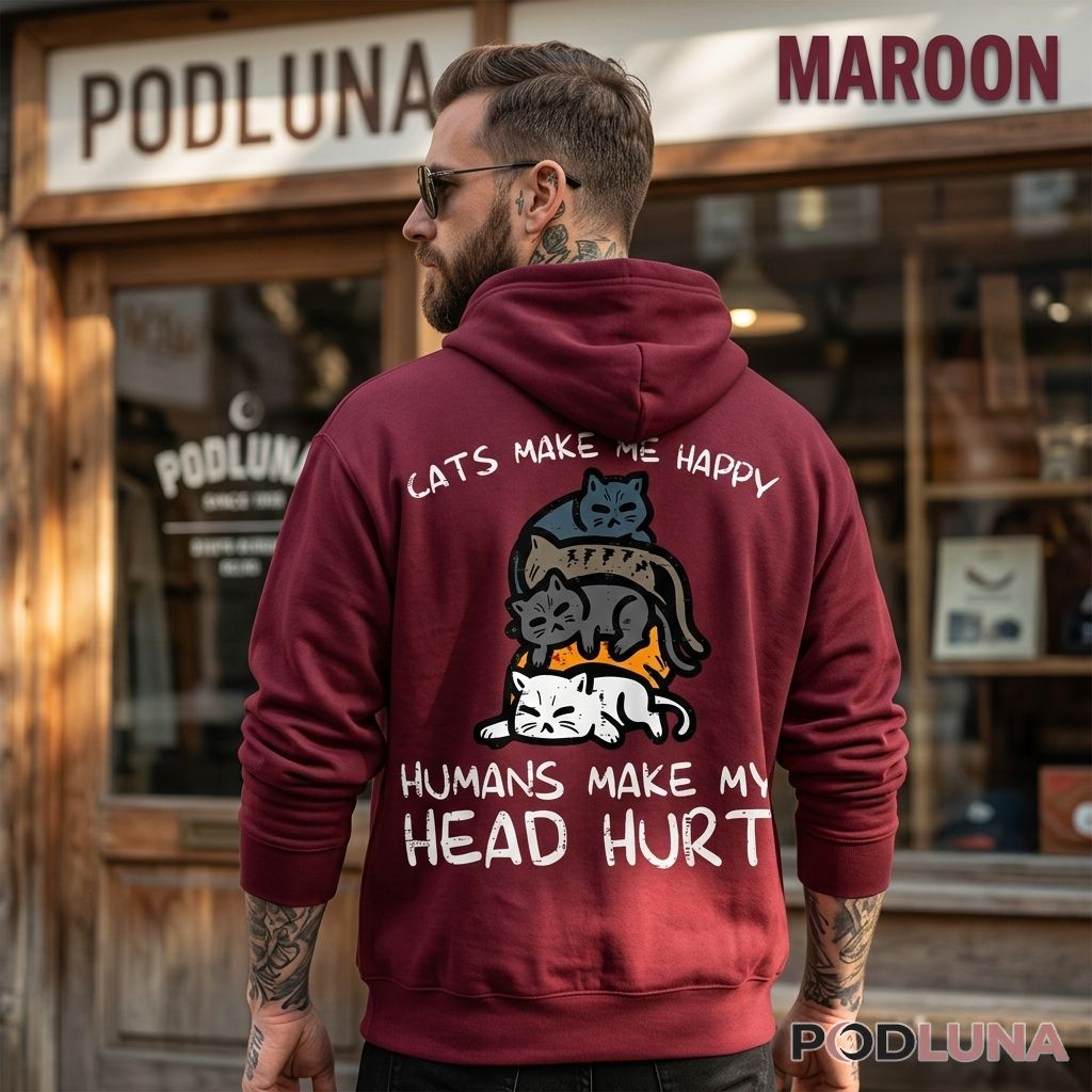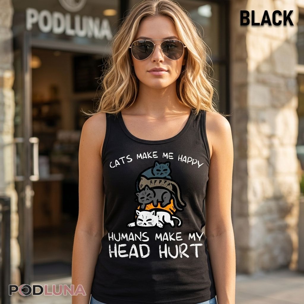 A funny introvert cat dad shirt stating the clearest social preference any cat person has ever expressed. The design features three cats stacked on top of each other in a cozy chaotic pile — a blue-grey cat on top, a darker grey cat in the middle, and a white cat flattened contentedly at the bottom — all rendered in a charming cartoon illustration style. “CATS MAKE ME HAPPY” arches across the top, “HUMANS MAKE MY HEAD HURT” anchors the bottom in bold hand-lettered text — the two lines together forming the most honest personality summary any introvert cat dad has ever worn.