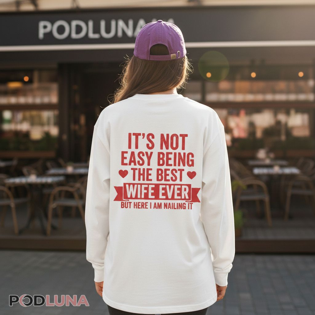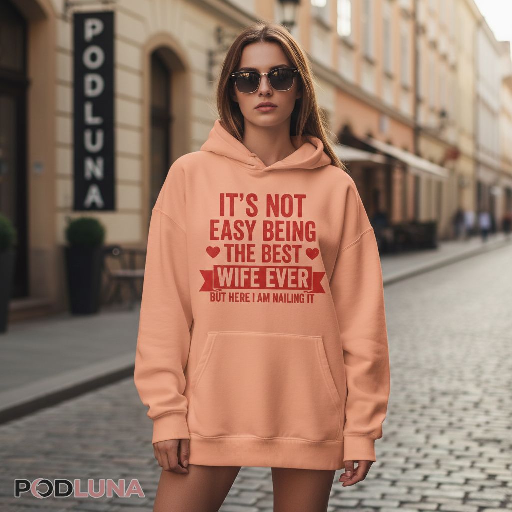 Being the best takes work—but you’re pulling it off anyway. This Funny Its Not Easy Being The Best Wife Ever Nailing It Shirt from Podluna comes in T-shirts, V-necks, hoodies, long sleeves, sweatshirts, and crewnecks for wives who appreciate humor mixed with a little self-congratulation. The coral-red text pops against burgundy fabric: “IT’S NOT EASY BEING” at the top, two heart symbols flanking “THE BEST,” a white banner highlighting “WIFE EVER,” and the kicker at the bottom—”BUT HERE I AM NAILING IT.”