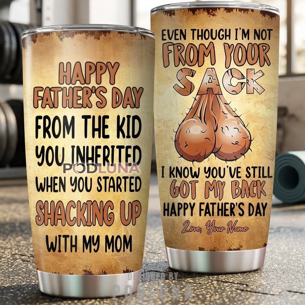 A rugged, humor-first funny stepdad tumbler set against a weathered parchment and earth-tone background, this personalized insulated drinkware delivers two sides of blended-family honesty in bold mixed typography: one side reads “Happy Father’s Day From The Kid You Inherited When You Started Shacking Up With My Mom,” while the other features a cartoon visual with “Even Though I’m Not From Your Sack, I Know You’ve Still Got My Back” signed off with a custom name. The distressed lettering, warm golden tones, and layered font styles give this stepfather gift tumbler a personality that is equal parts roast and genuine appreciation.