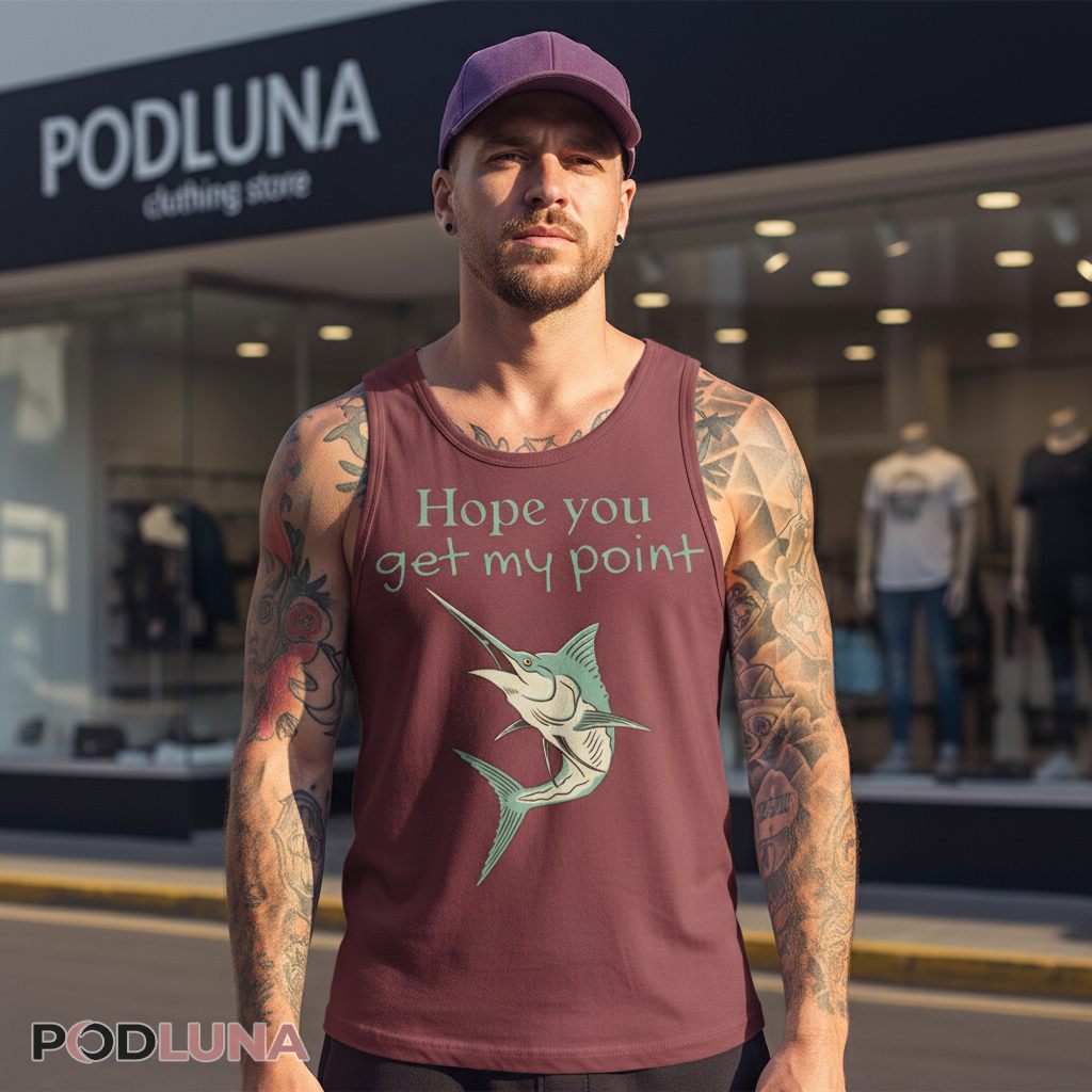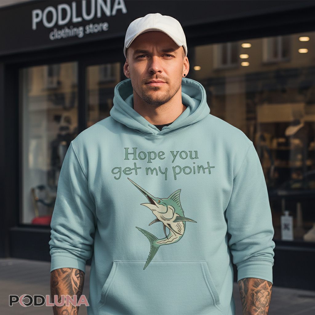 A clever fishing pun appears on this t-shirt combining marine life imagery with wordplay that resonates with anglers who appreciate subtle humor. The design features elegant text reading “Hope you get my point” in a casual handwritten-style font with the word “point” flowing in cursive script. Below the text, a detailed swordfish illustration dominates the composition, rendered in soft teal and white tones that create gentle contrast. The swordfish appears in dynamic motion with its distinctive long, pointed bill extending prominently—the visual punchline that makes the phrase work. The fish’s streamlined body shows realistic anatomical details including dorsal fin, tail, and characteristic markings. The entire design relies on understated humor where “point” refers both to the message and literally to the swordfish’s sharp bill, creating a double meaning that lands perfectly without being overly aggressive or obvious in its delivery.