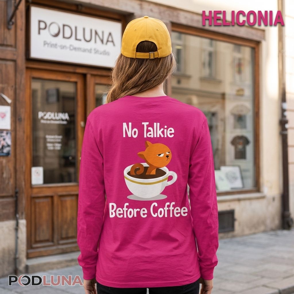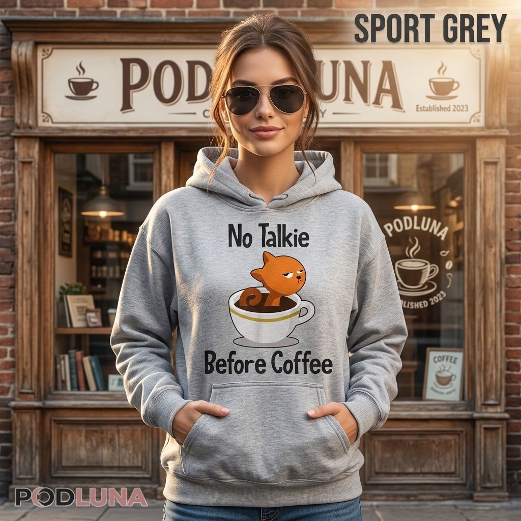 A cat and coffee shirt uniting the two most relatable morning non-negotiables in one perfectly grumpy back-print. The design features a round orange cat sitting deep inside a large coffee cup, expression locked in maximum disapproval, tail curled over the rim — the visual embodiment of someone who has been spoken to before the first sip. “No Talkie” sits above in bold rounded lettering, “Before Coffee” anchors below, the cat’s face doing the rest of the communication entirely on its own.