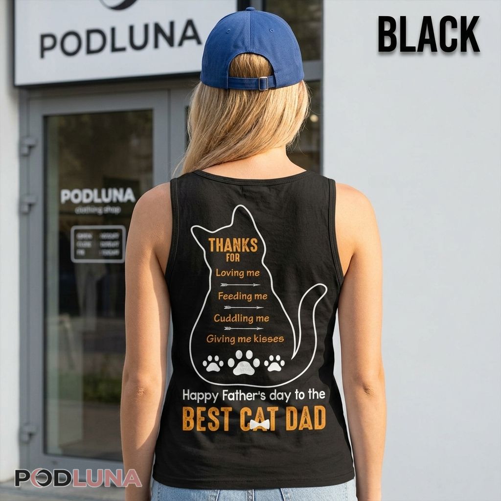 A Father’s Day cat dad shirt written entirely from the cat’s perspective in the most heartfelt way a cat would ever allow itself to express. The design features a clean outline silhouette of a sitting cat filled with the cat’s personal thank-you list: “THANKS FOR — Loving me, Feeding me, Cuddling me, Giving me kisses” with small arrow accents between each line and three paw prints at the base. “Happy Father’s Day to the BEST CAT DAD” completes the tribute below the silhouette — the whole design functioning as a card and a shirt simultaneously.