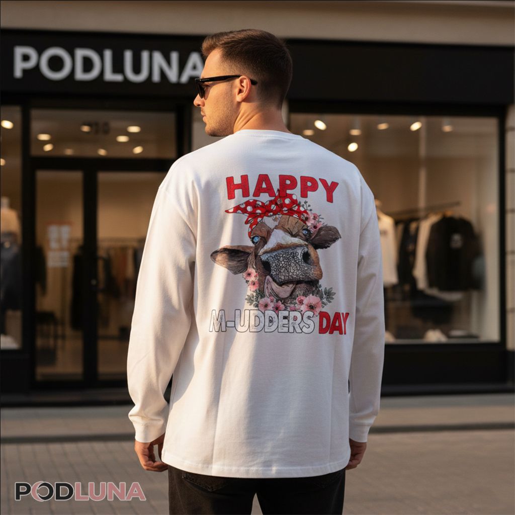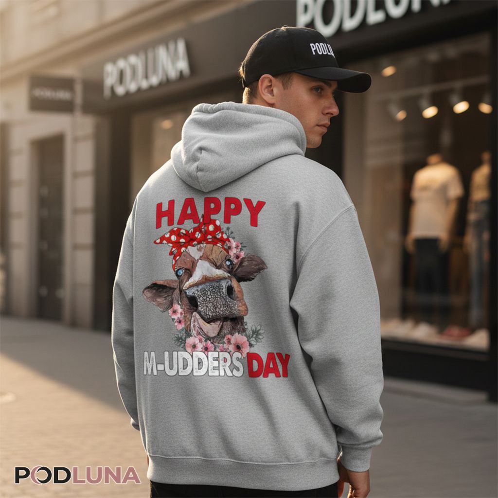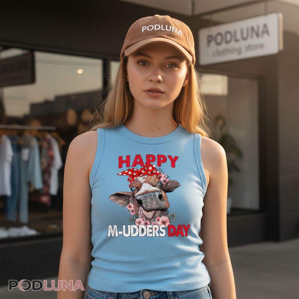 Charming farm animal illustration paired with wordplay creates this playful Mother’s Day t-shirt. At the top, “HAPPY” appears in bold red block letters with distressed texture. Below sits a detailed cow portrait showing realistic features—spotted nose, gentle expression, and large ears. The cow wears a red bandana with white polka dots tied fashionably on its head, giving it personality and charm. Pink flowers tuck behind the bandana and around the cow’s face, adding feminine softness. Small floral elements scatter around the portrait. At the bottom, “M-UDDERS DAY” plays on “Mother’s Day” in white and red lettering, creating a farm-themed pun that’s immediately clear thanks to the cow illustration above. The design balances cute farm animal imagery with clever wordplay for a humorous Mother’s Day tribute.